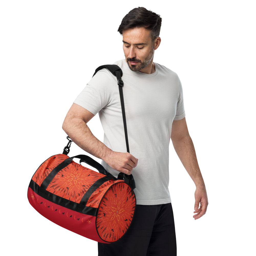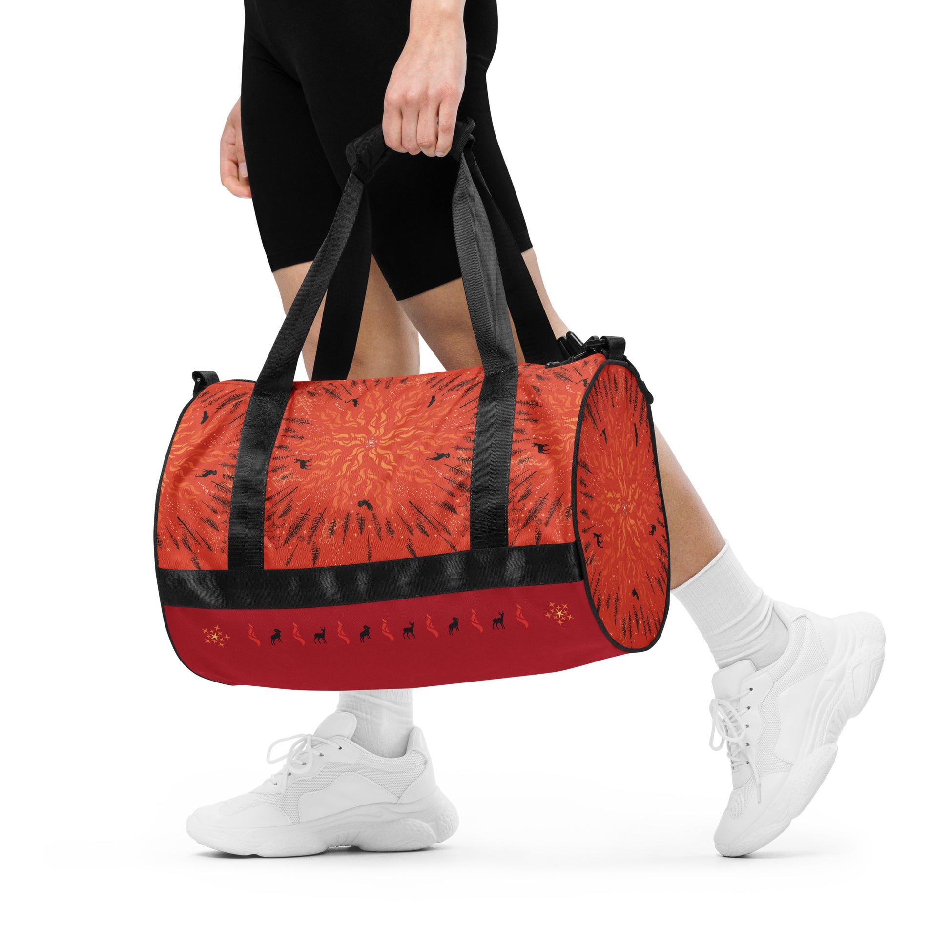 Recent wildfires out west inspired this design. “Indigenous burning" was the original fire system in North America, and should be a component of any attempt to solve wildfire problems. This lush square scarf is designed with the hope that people become more connected with the land, and in turn care for the Earth. It is illustrated with animals of the West Coast USA and a bright red radiating circle of good fire. Ready to get your fitness on? Add some punch to pumping iron with this all-over print gym bag. Made from sturdy, water-resistant fabric, this bag is fun meets function. And it’s got pockets!