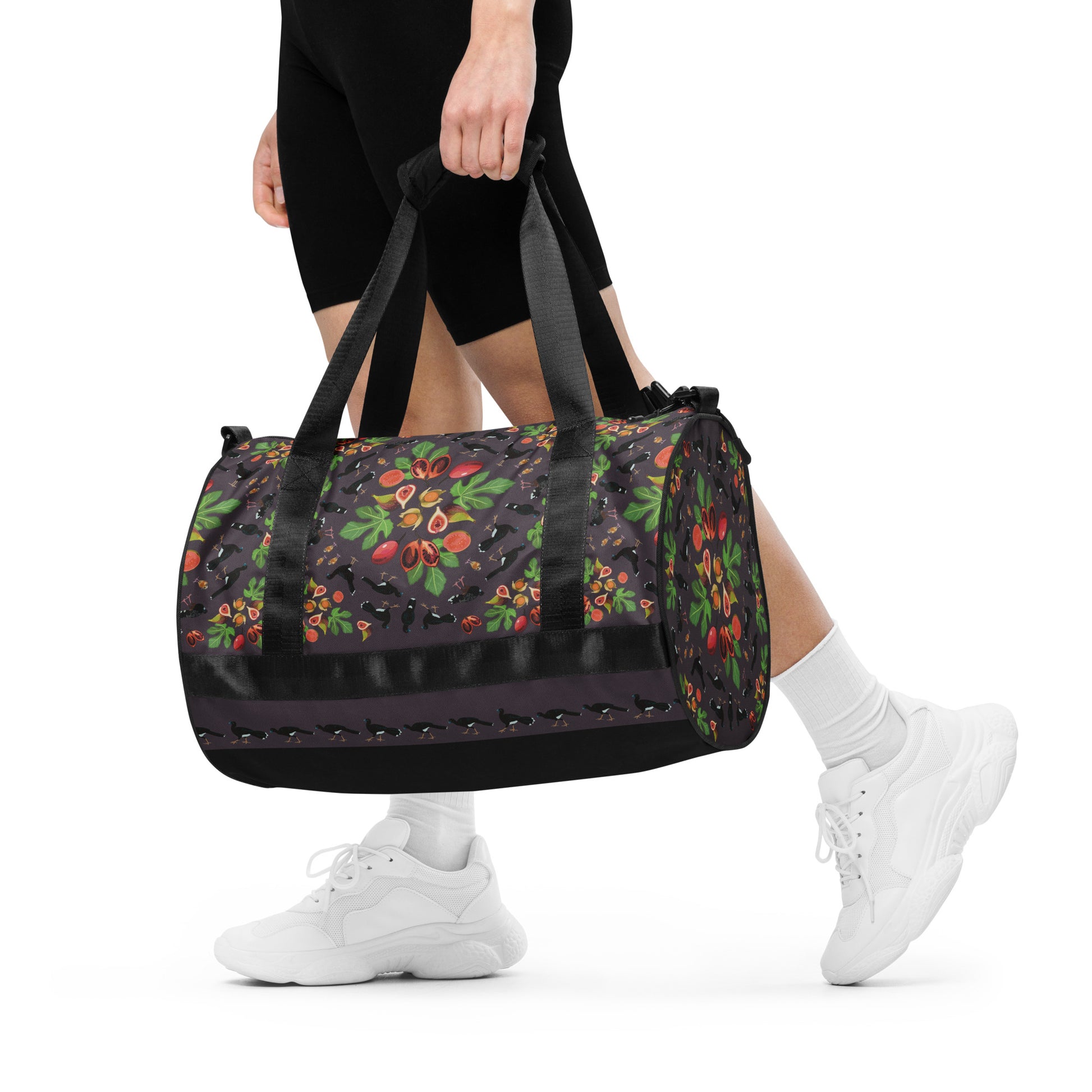 Ready to get your fitness on? Add some punch to pumping iron with this all-over print gym bag. Made from 100% polyester and sturdy, water-resistant fabric, this bag is fun meets function. And it’s got pockets!
