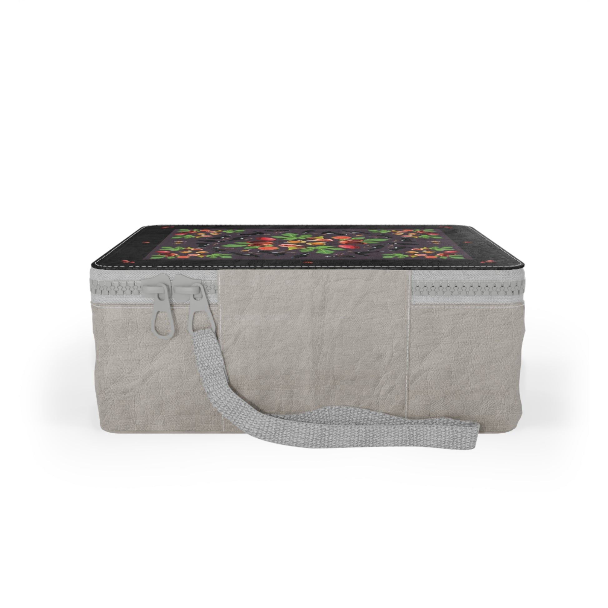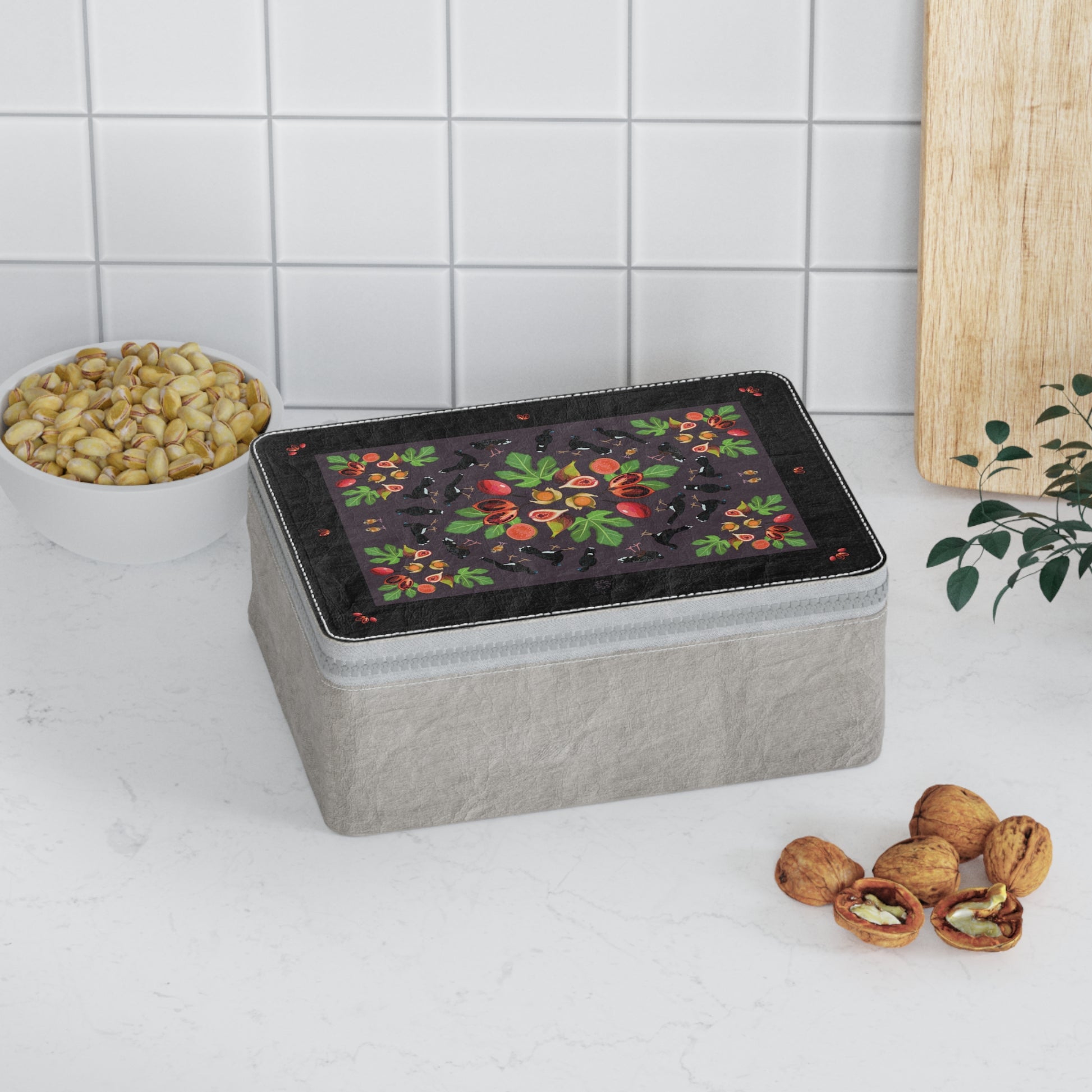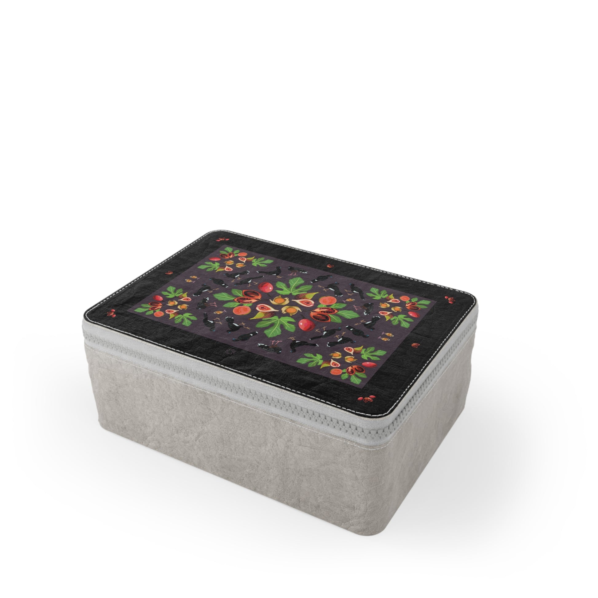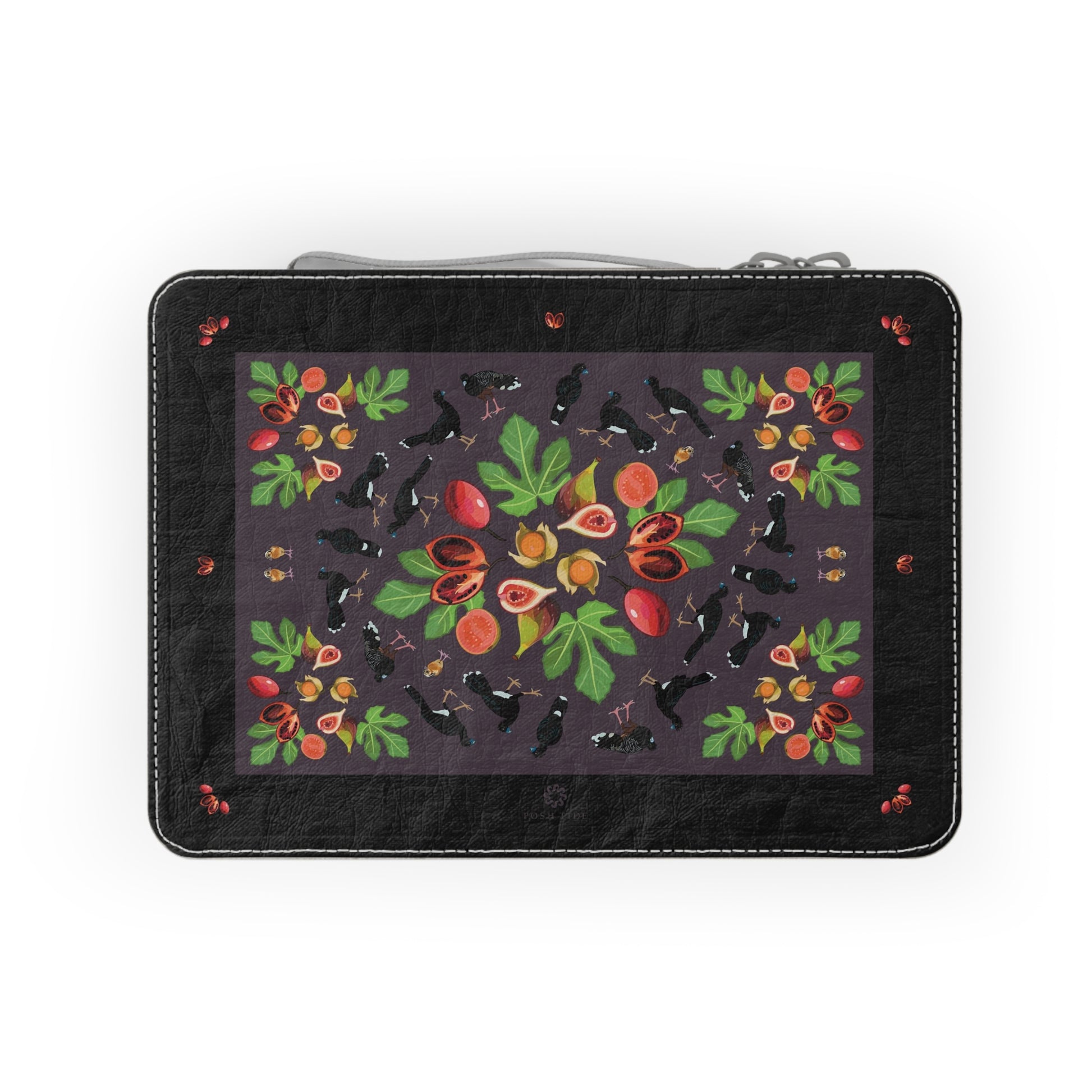 Made with FSC® certified 100% eco paper material, this personalized paper bag is the perfect accessory for any eco-conscious customer. Featuring a full-print cover decorated with illustrations of the blue-billed curassow, which are black with white feathers on its rear underbelly and at the tip of its tail. Scientifically known as the Crax alberti, this bird is an endangered species. Today, the entire wild population occurs in just a few small remnant areas of tropical lowland forest. Also depicted are a variety of fruits from Columbia, South America. It is constructed with a zipper closure, and a carrying strap. The only caveat, we are not sure it would contain a large liquid spill inside, so you might not want to pack a bowl of soup that is not sealed well.