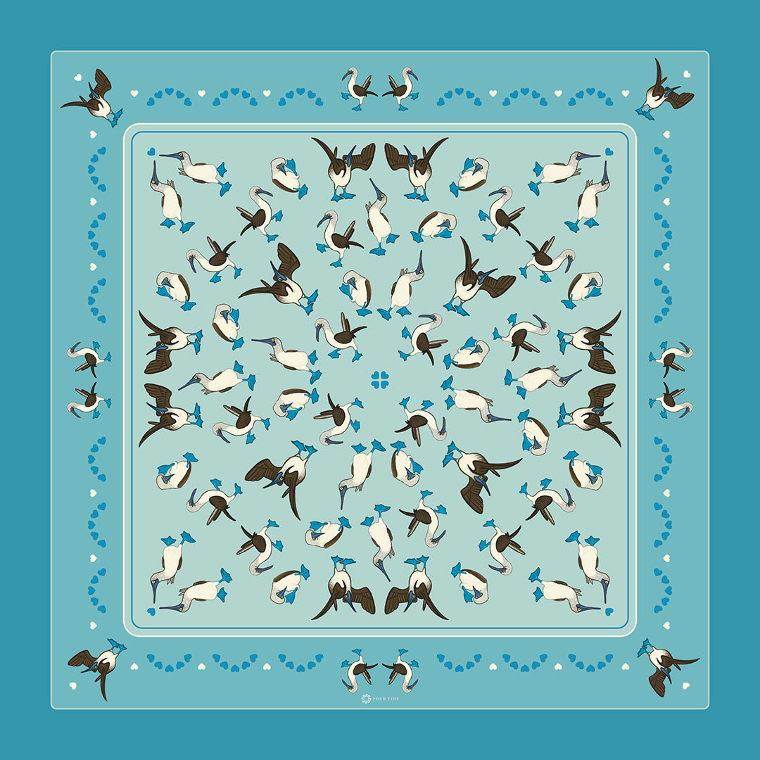 Few creatures dance with as much awkward charm as the blue-footed booby, whose brilliant feet glow brightest when well-nourished. These illustrations celebrate their vibrant spirit and joyful flair. One side is blue, the other mostly pink.