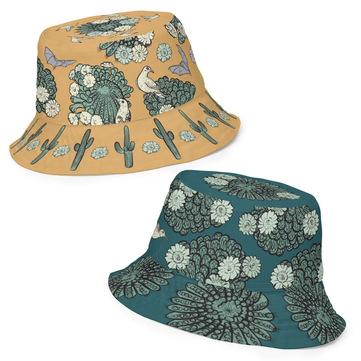 Two hats for the price of one! This Reversible Bucket Hat features illustrations which are a tribute to the profound connection between the saguaro cactus and its desert pollinators—a testament to the intricate web of life. The intricate illustrations on this hat capture the essence of this keystone species while honoring their amazing contribution to the medical field. and worn on both sides, making it easy to match with different outfits. Made of breathable premium fabric.