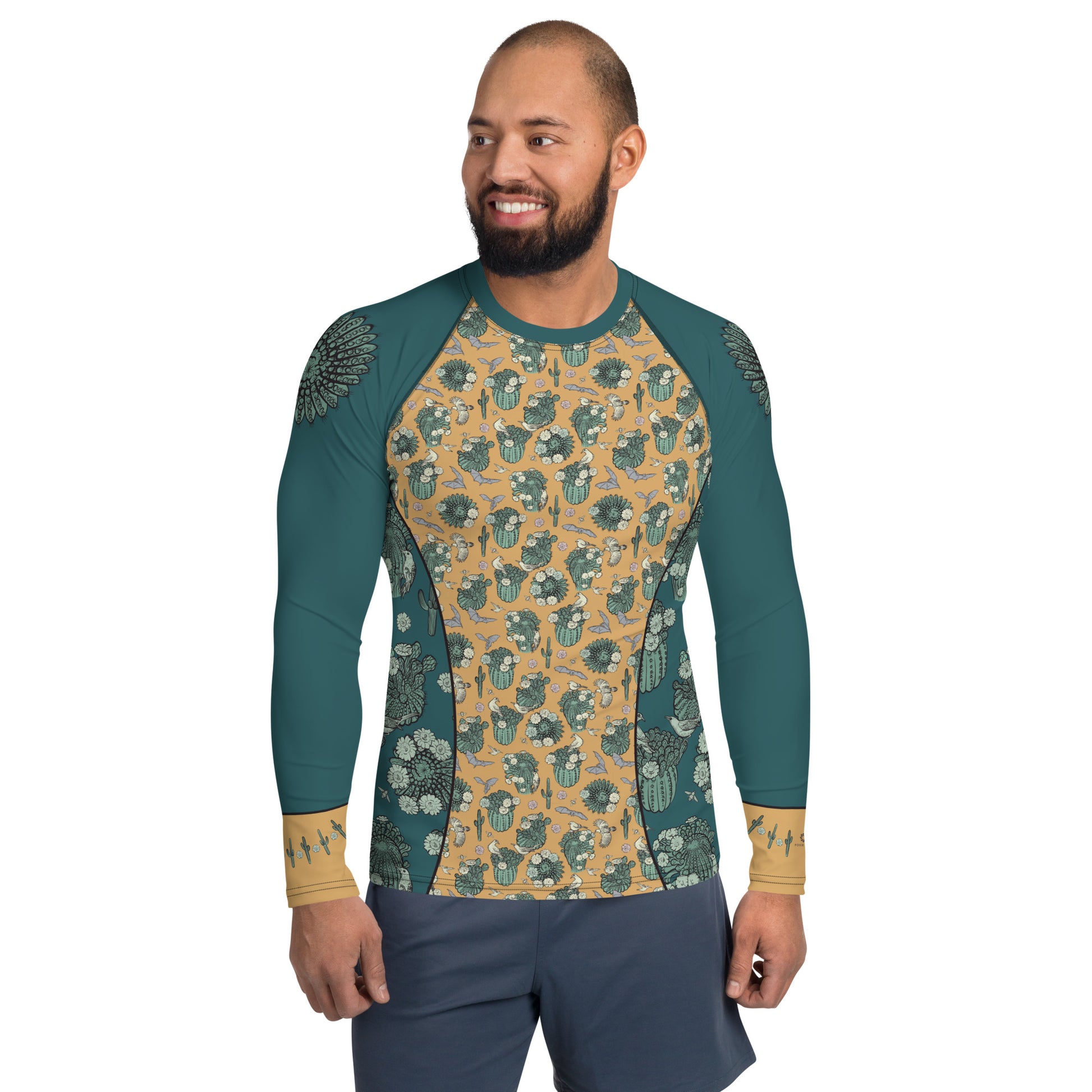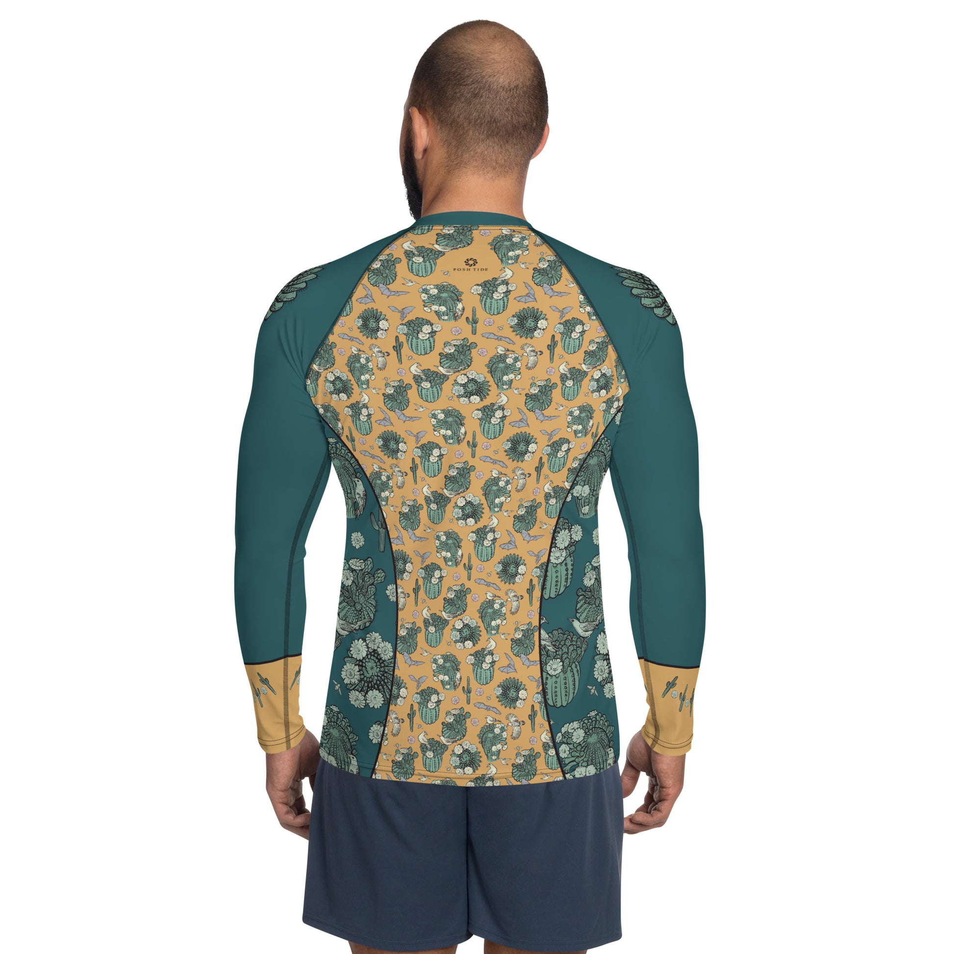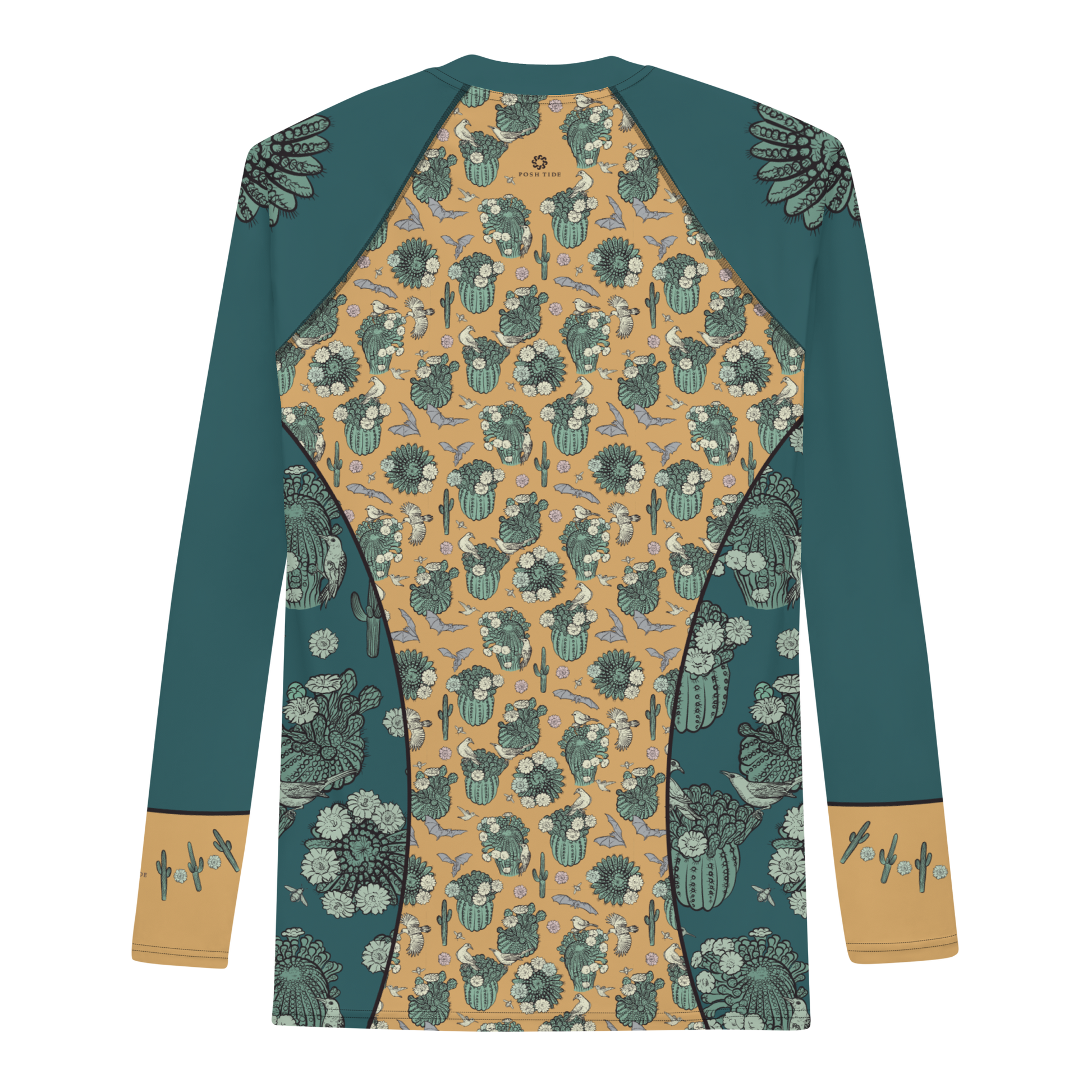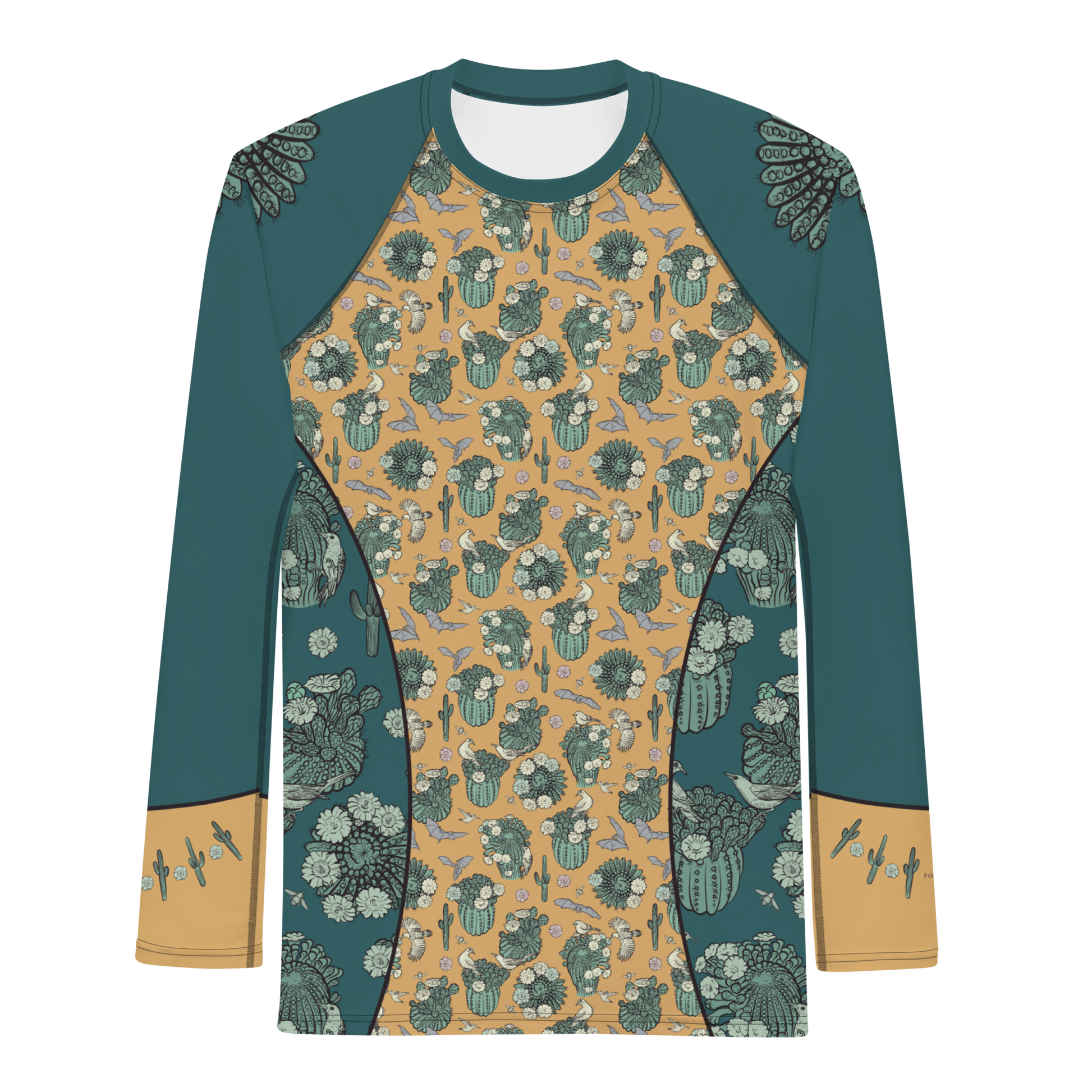 The sun, sand, wind, or other elements won't be a problem when doing sports thanks to this smooth and versatile long-sleeve rash guard. It protects from the sun and bruising. It's slim fit, flat ergonomic seams and long body is decorated with illustrations which are a tribute to the profound connection between the saguaro cactus and its desert pollinators—a testament to the intricate web of life.