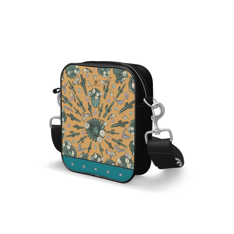 Our cross-body messenger bag is the perfect solution to keeping all your essentials safe and organized. With its top-zip design, you can easily access all your items without having to rummage. The strap is adjustable, and can be clipped to a chair for added security. The illustrations on the front panel are a tribute to the profound connection between the saguaro cactus and its desert pollinators—a testament to the intricate web of life. The back side has a convenient zip pocket, perfect for storing small items that you need to access quickly.