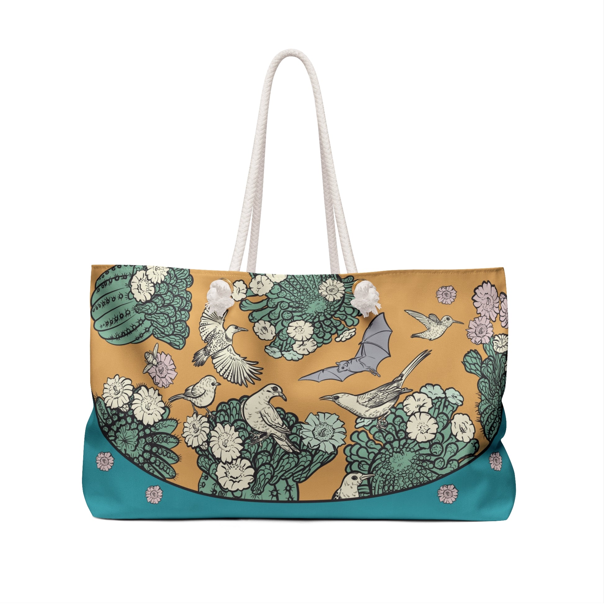 A roomy, artful weekender that travels as well as you do. The wide, T-bottom silhouette holds clothes, a sweater, and a pair of shoes without bulging; cream rope handles sit comfortably over the shoulder and thread through gold-colored grommets for a touch of polish. The exterior’s spun polyester resists wrinkles and keeps the vivid teal-and-golden bird-and-floral illustration looking fresh, while the soft cream sheeting lining protects delicate items. Lightweight yet structured, this bag ca