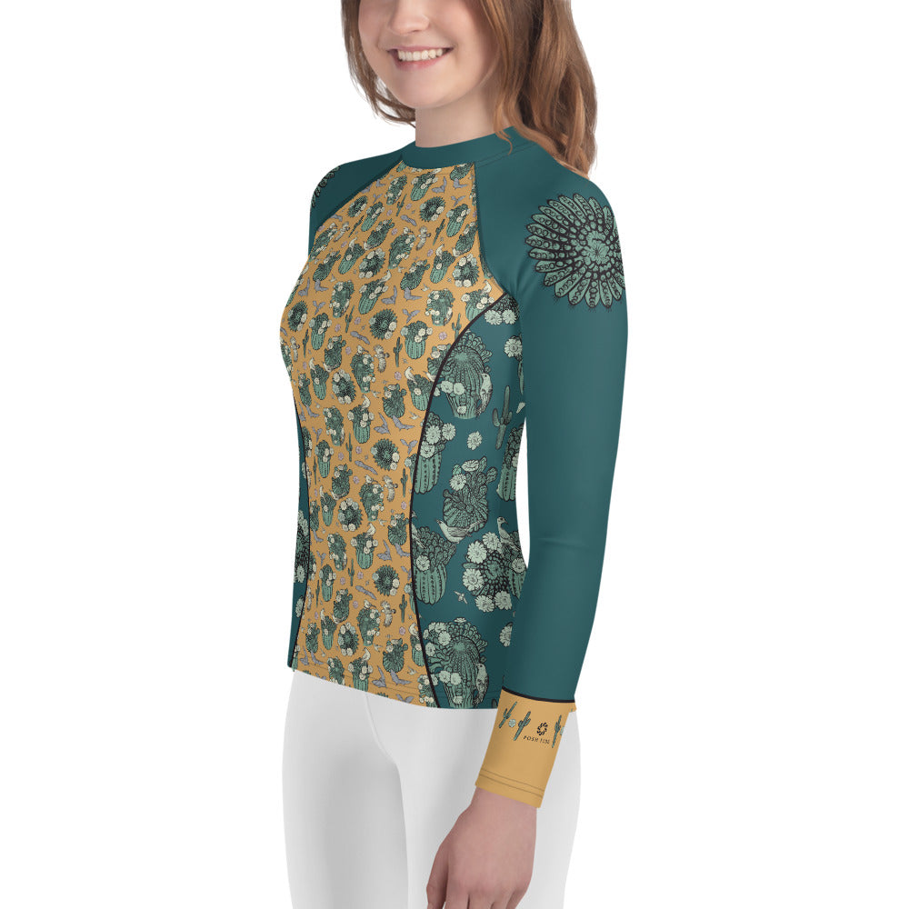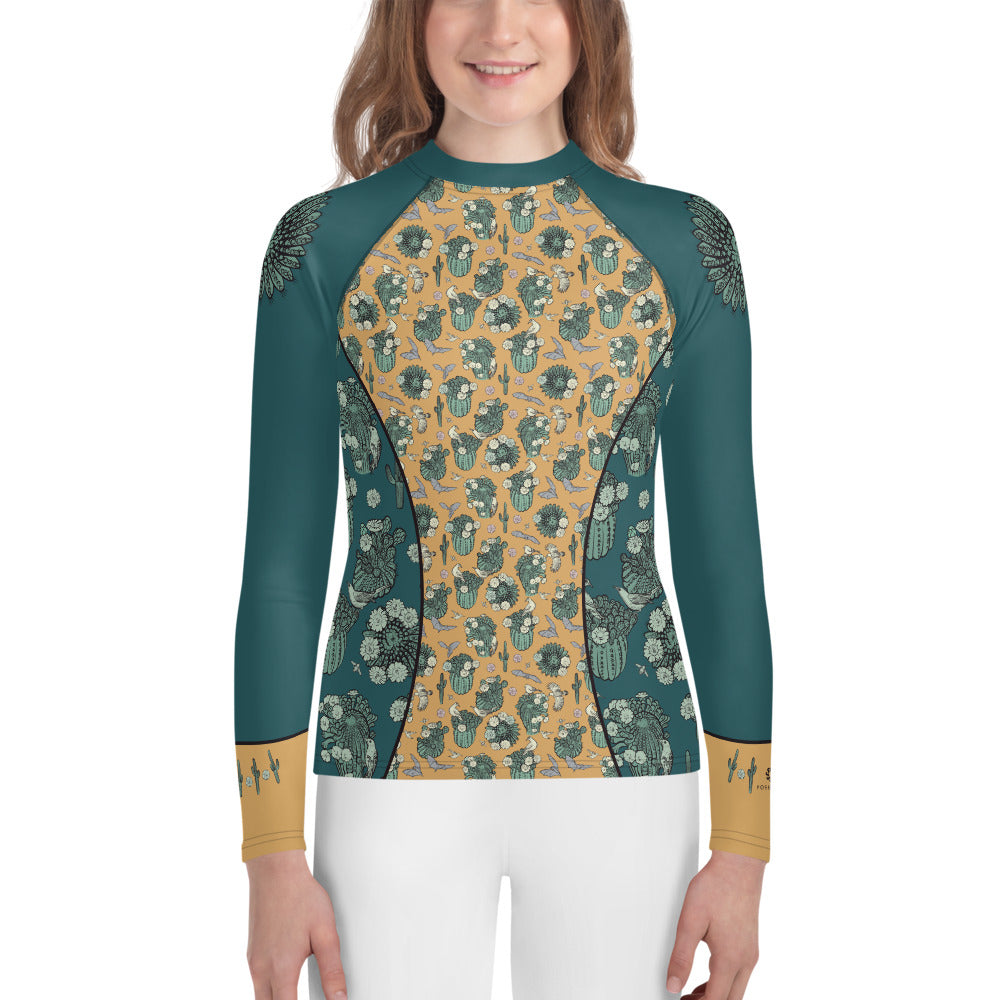 The sun, sand, wind, or other elements won't be a problem when doing sports thanks to this smooth and versatile long-sleeve rash guard. It protects from the sun and bruising. It's slim fit, flat ergonomic seams and long body is decorated with illustrations which are a tribute to the profound connection between the saguaro cactus and its desert pollinators—a testament to the intricate web of life.