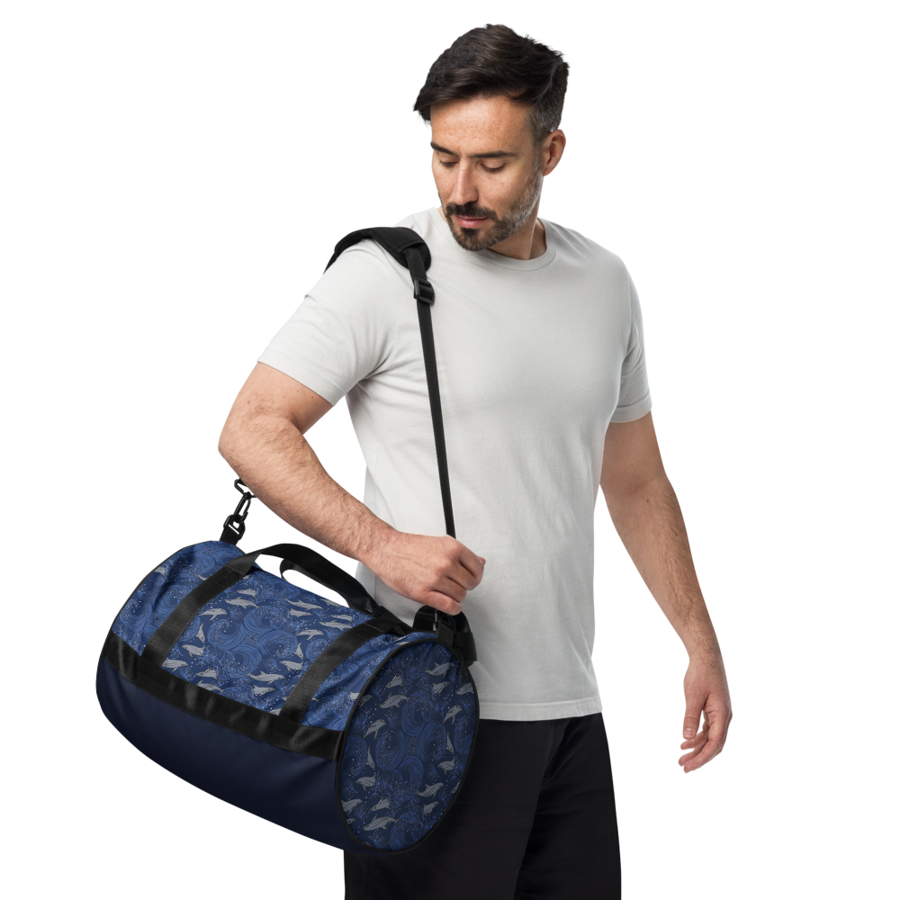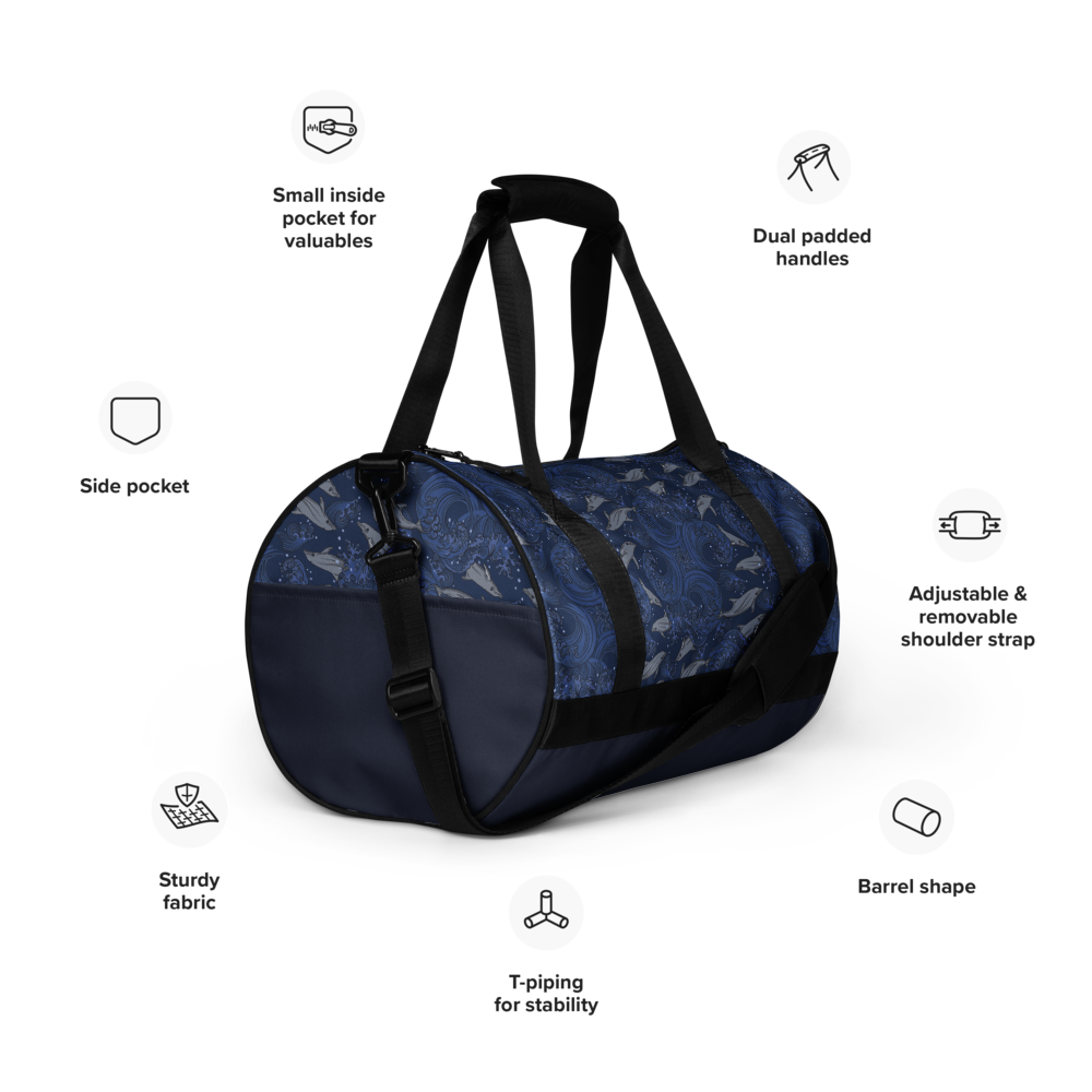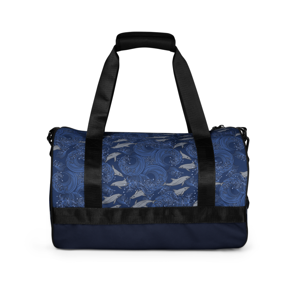 Dolphins surf, play, get in trouble with their mothers and are generally much loved by us humans. For eons, seafarers have delighted seeing them swim alongside boats, gathering speed from the wake of ships. This practical gym bag features lyrical illustrations of dolphins jumping through a background of rich blue rolling waves bordered with a band of deep blue. Just imagining dolphins jumping should inspire you to get your fitness on. Made from sturdy, water-resistant fabric, this bag is fun meets function. And it’s got pockets!