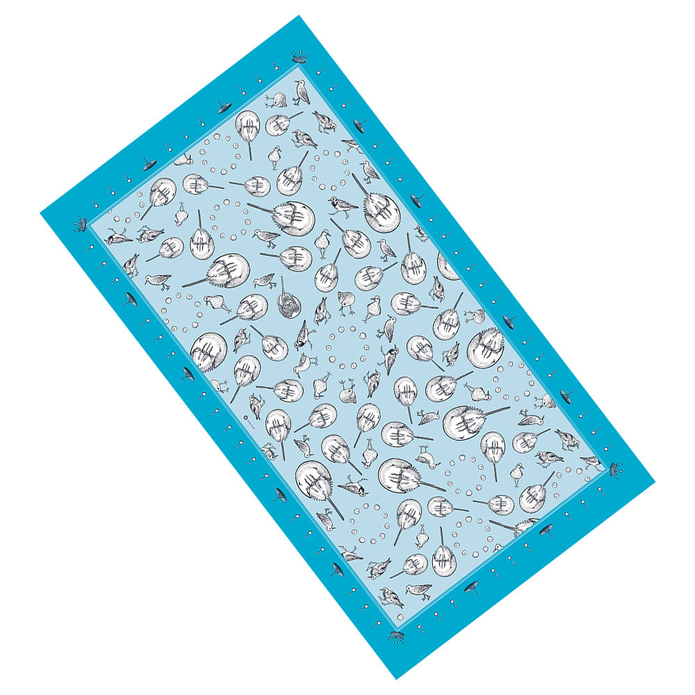 This sarong features illustrations of the miraculous horseshoe crab, a creature older than the dinosaurs. Birds like red knots, semipalmated sandpipers and ruddy turnstones rely on the eggs of this ancient species to fuel their herculean migrations. The medical industry also loves horseshoe crabs for their astounding blue blood which can detect toxins. The intricate illustrations capture the essence of this keystone species while honoring their amazing contribution to the medical field.