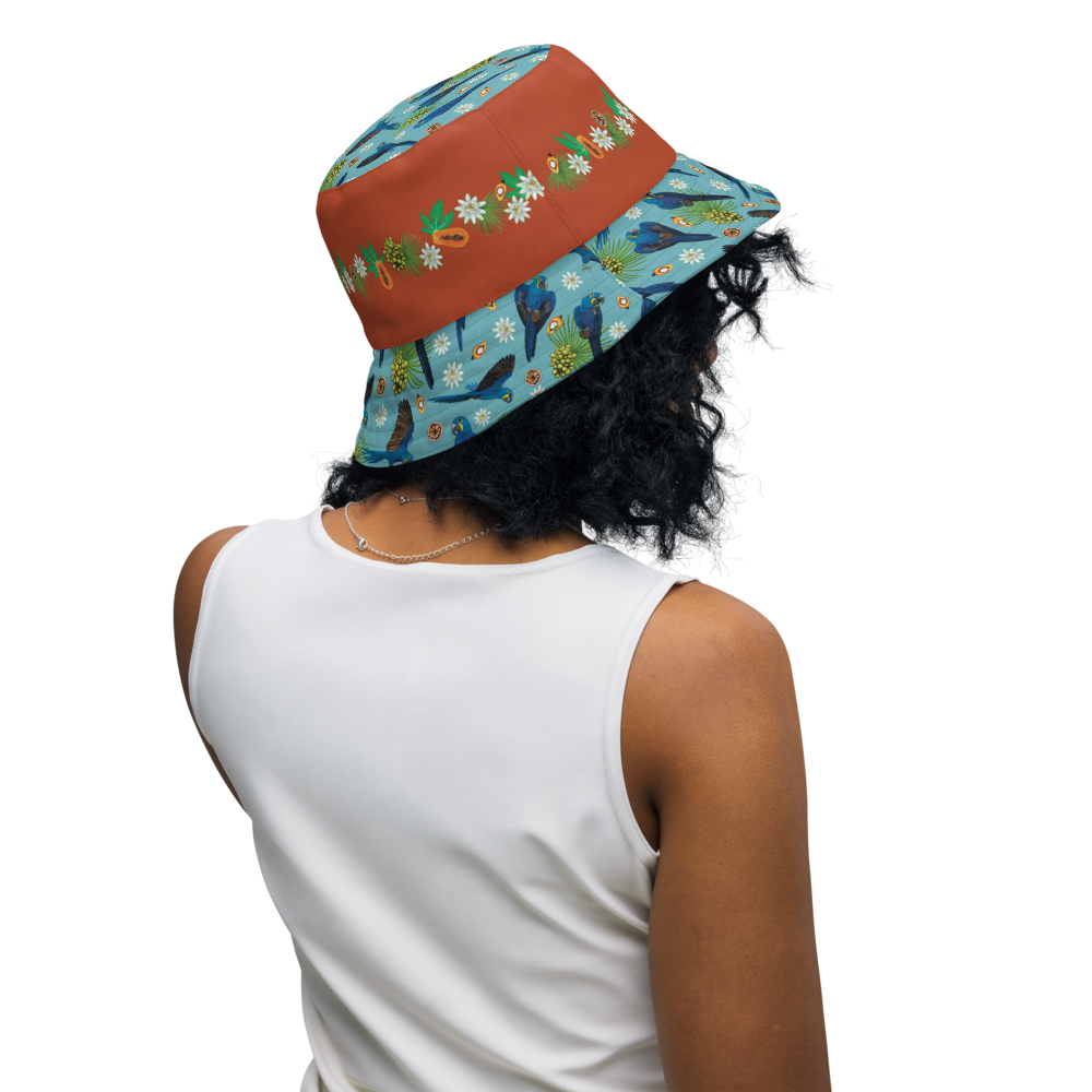 This reversible bucket hat is decorated with beautiful illustrations of the hyacinth macaw which is sometimes called the gentile giant of parrots, even though it is the largest parrot of South America and can easily crack a coconut in its beak! This hat can be worn on both sides, making it easy to match with different outfits. Made of breathable premium fabric, this hat will become your go-to streetwear accessory.