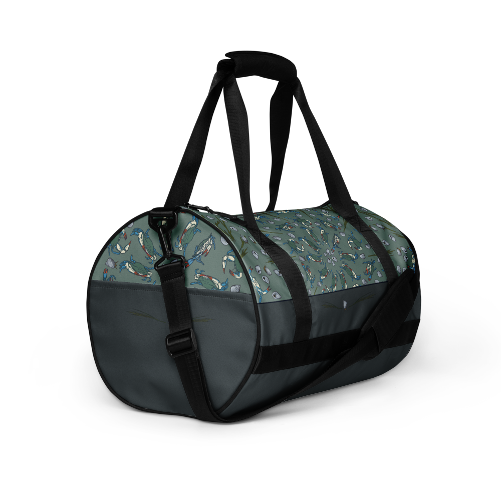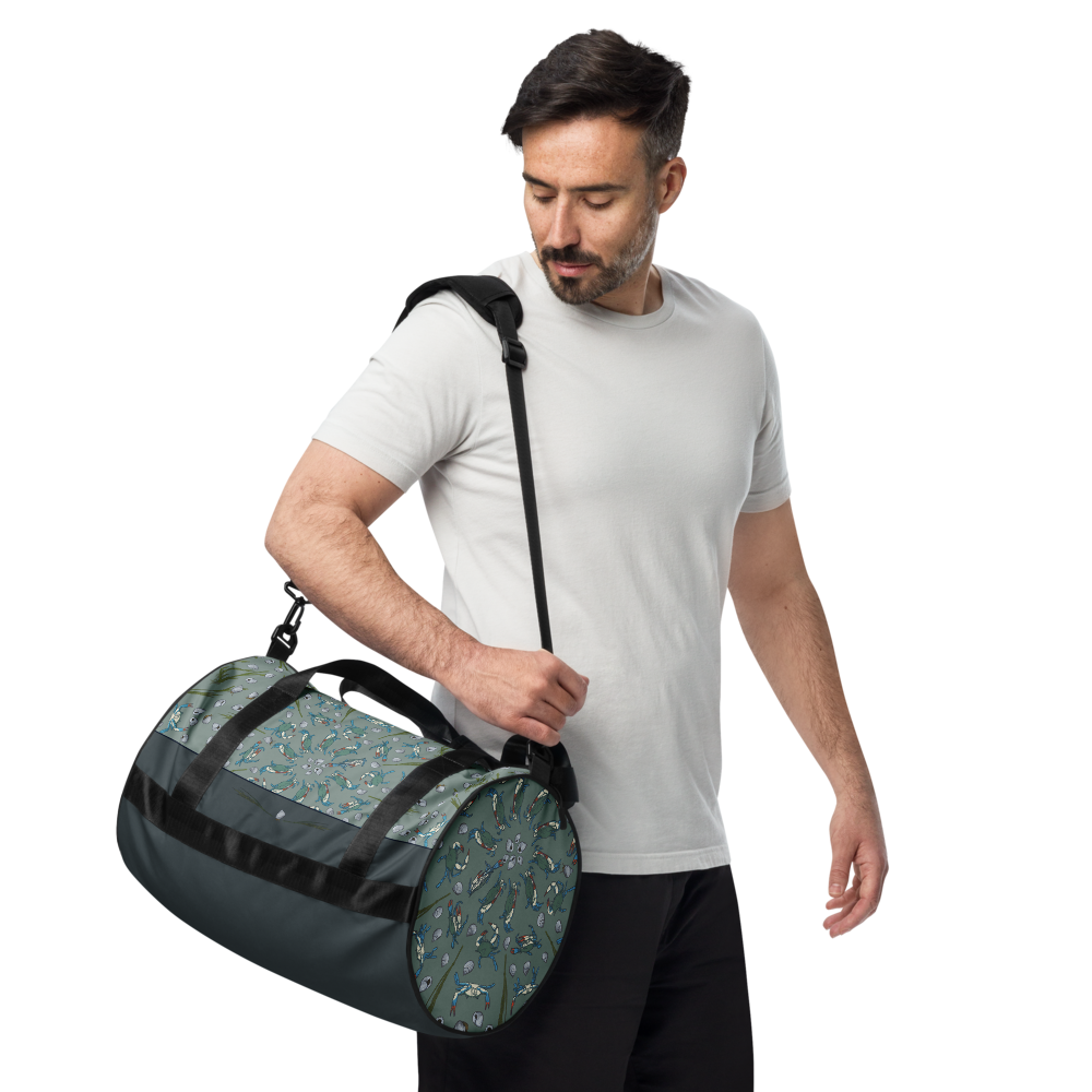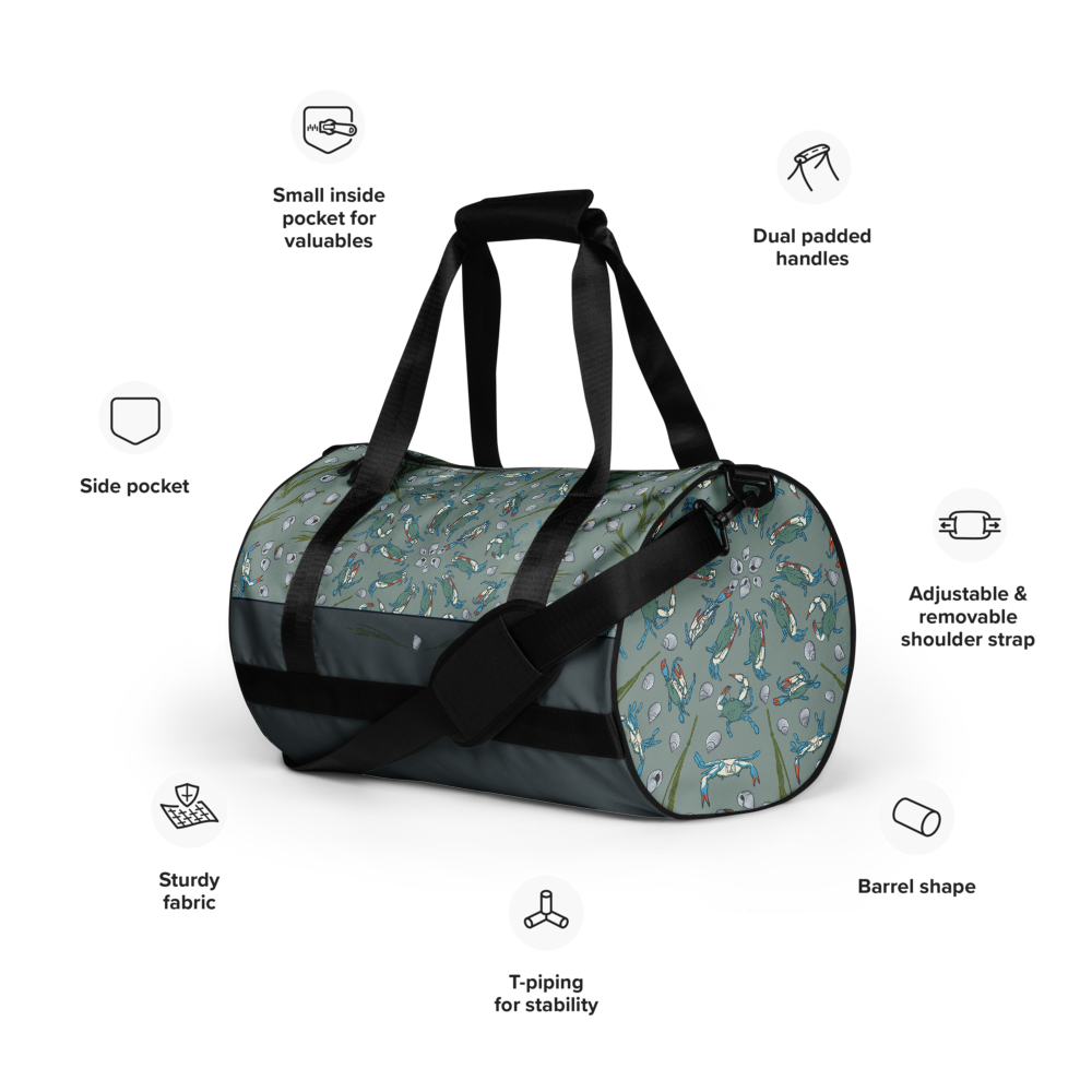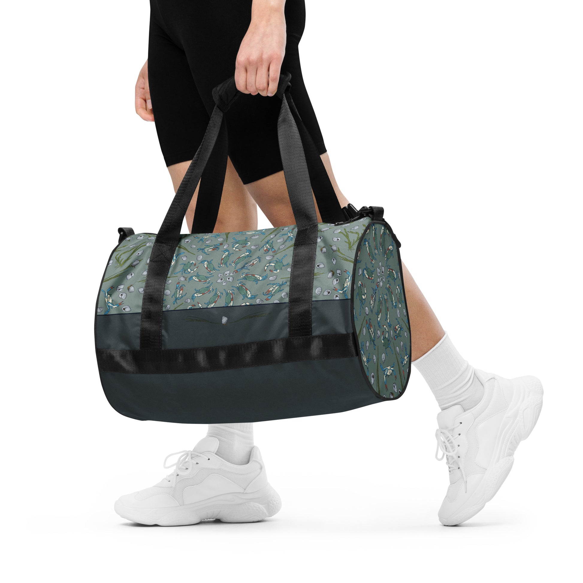 The color palette has rich tones of greens and blues with pale periwinkle shells.Add some punch to pumping iron with this all-over print gym bag. Made from 100% polyester and sturdy, water-resistant fabric, this bag is fun meets function. And it’s got pockets!