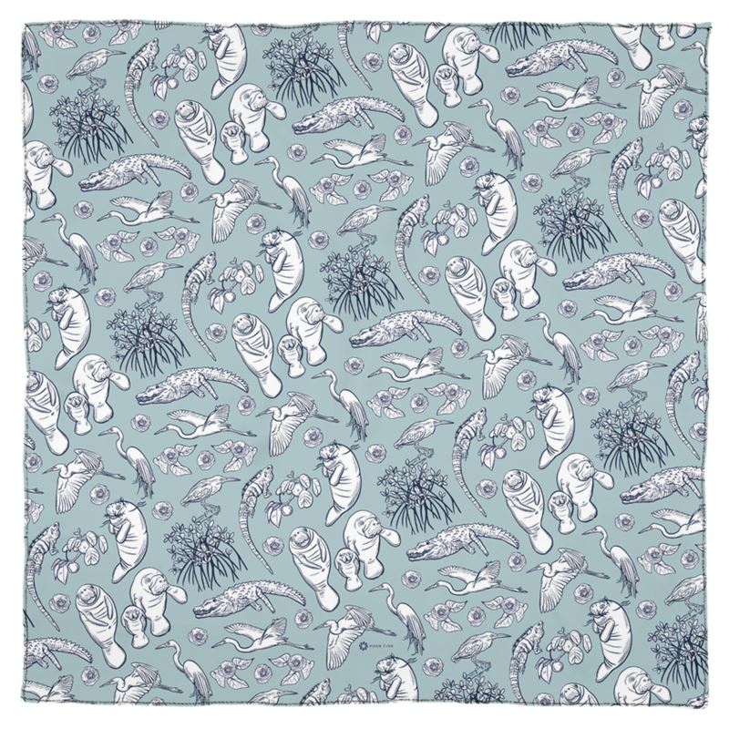 This gorgeous square scarf is decorated with illustrations inspired by the Florida Everglades, which host to some remarkable flora and fauna. Consider the American crocodile, a gorgeous creature who lives by the mangroves. Imagine the gentile manatees popping up with seagrass on their heads. This scarf honors these wild and beautiful creatures.