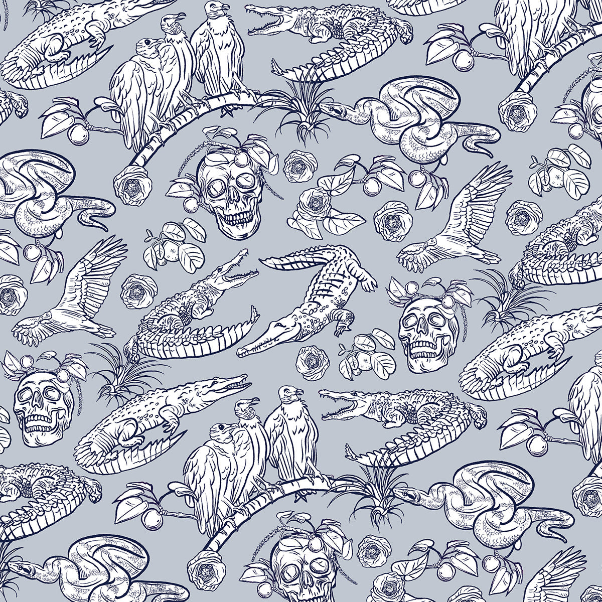 This gym bag is decorated with linear illustrations inspired by the Florida Everglades which are host to some remarkable flora and fauna. On this scarf is the manchineel tree, a tree so toxic one could go blind if sheltering beneath it during a rainstorm. Also the American crocodile, skulls, and vultures which laugh in unison on a light gray background. Get your fitness on! Add some punch to pumping iron with this all-over print gym bag. Made from 100% polyester and sturdy, water-resistant fabric, this bag is fun meets function. And it’s got pockets!