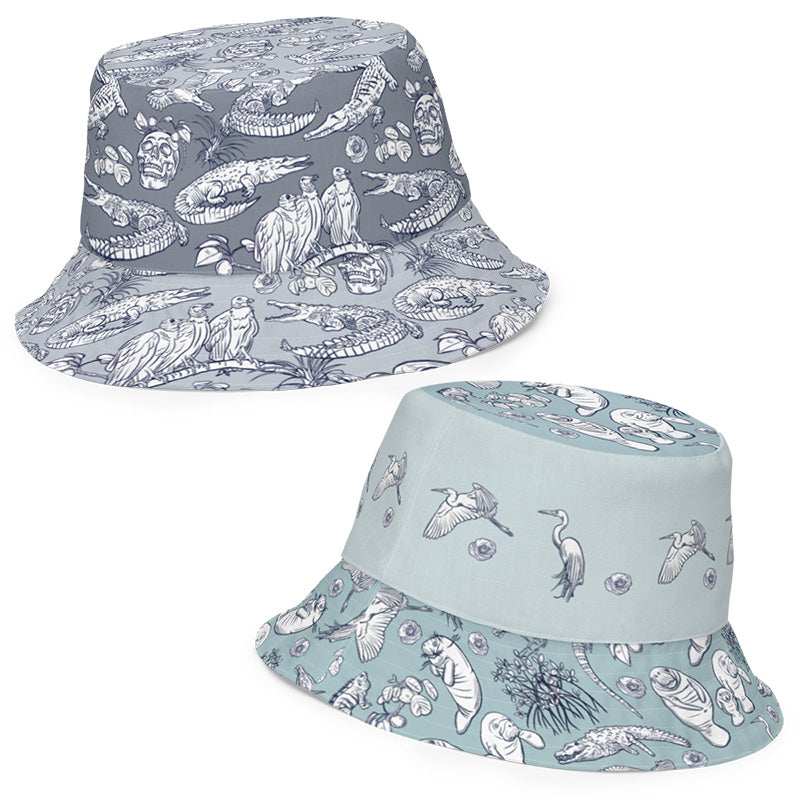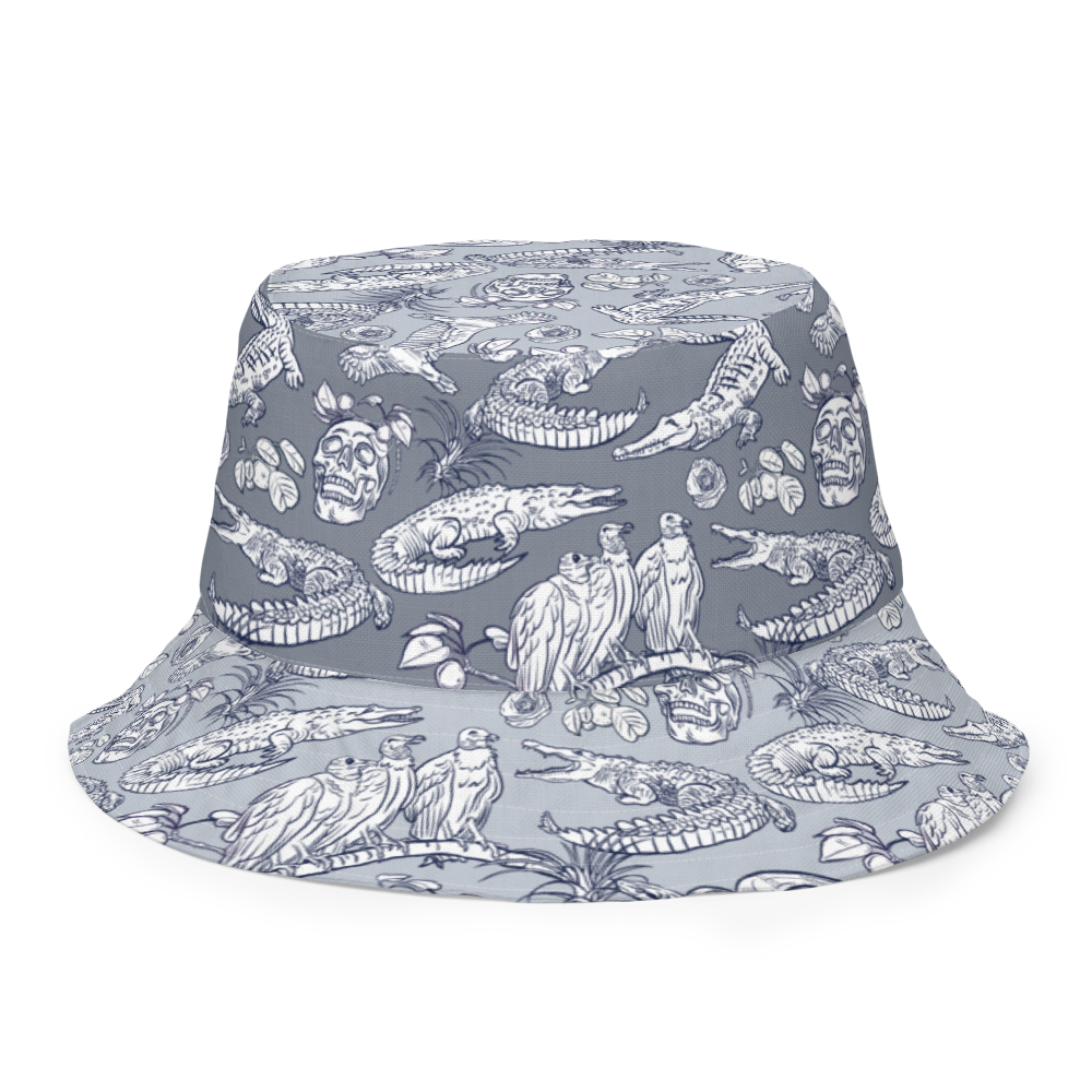 This reversible bucket hat is decorated with illustrations inspired by the Florida Everglades, which are host to some remarkable flora and fauna. Consider the manchineel tree, a tree so toxic one could go blind if sheltering beneath it during a rainstorm. Or the American crocodile, a gorgeous creature who lives by the mangroves. This hat honors these wild beauties with a touch of dark humor as the skulls, crocodiles and vultures laugh in unison. It also protects your ears from UV rays.