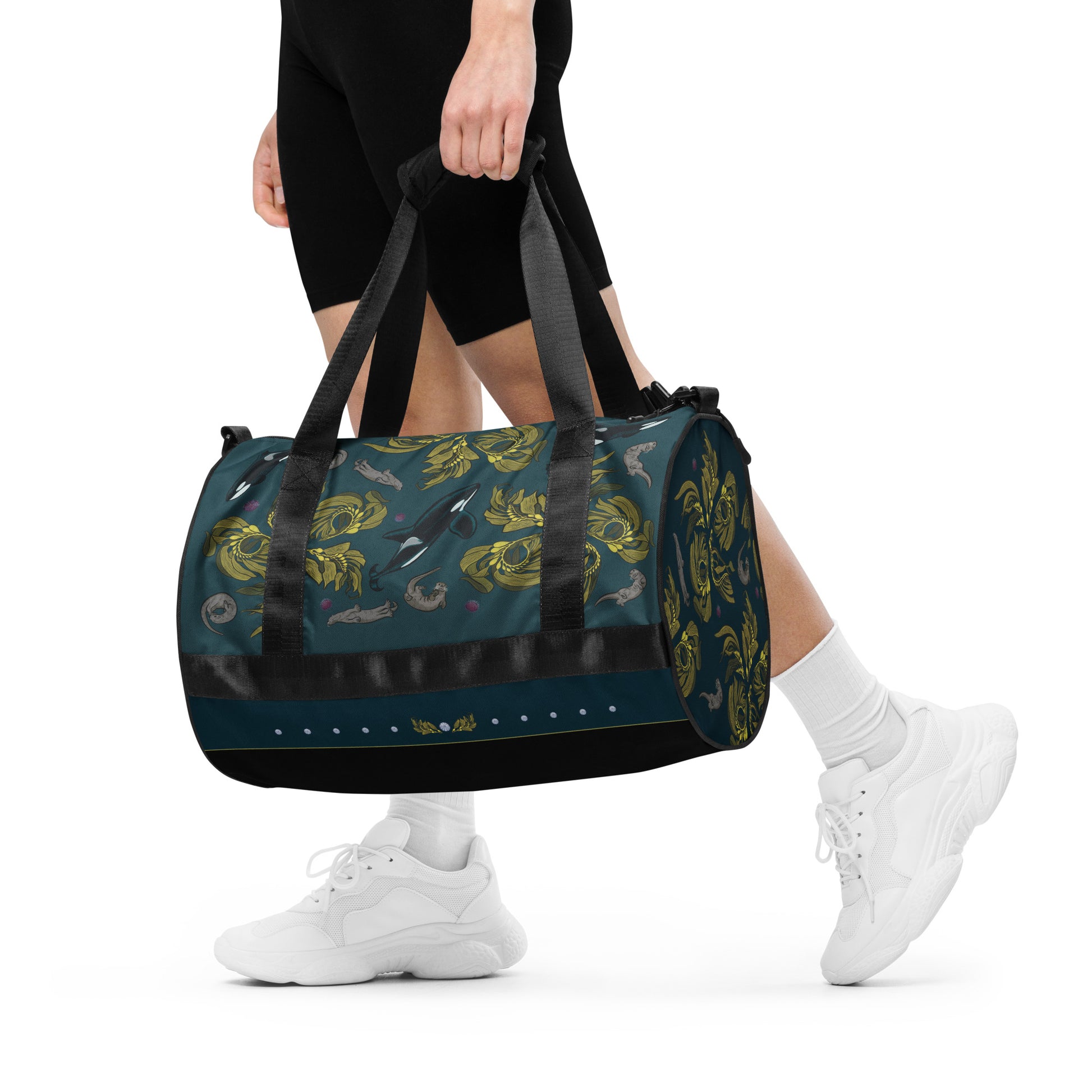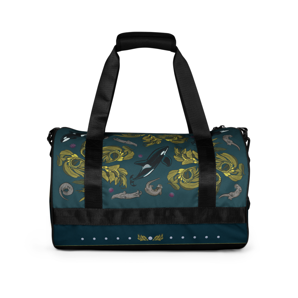 Ready to get your fitness on? Add some punch to pumping iron with this gym bag. Made from 100% polyester and sturdy, water-resistant fabric, this bag is fun meets function. It’s got pockets! And is is decorated with lush kelp gardens, watery forests that protect many ocean species. Sea otters eat a ton of sea urchins which eat kelp. In places where sea otters have disappeared, the urchins will eat the kelp forest until it’s gone. They leave behind desolate areas called urchin barrens. If orcas eat otters because they can’t find what they normally eat, it throws the kelp ecosystem out of balance. This collection is dedicated to these amazing creatures.