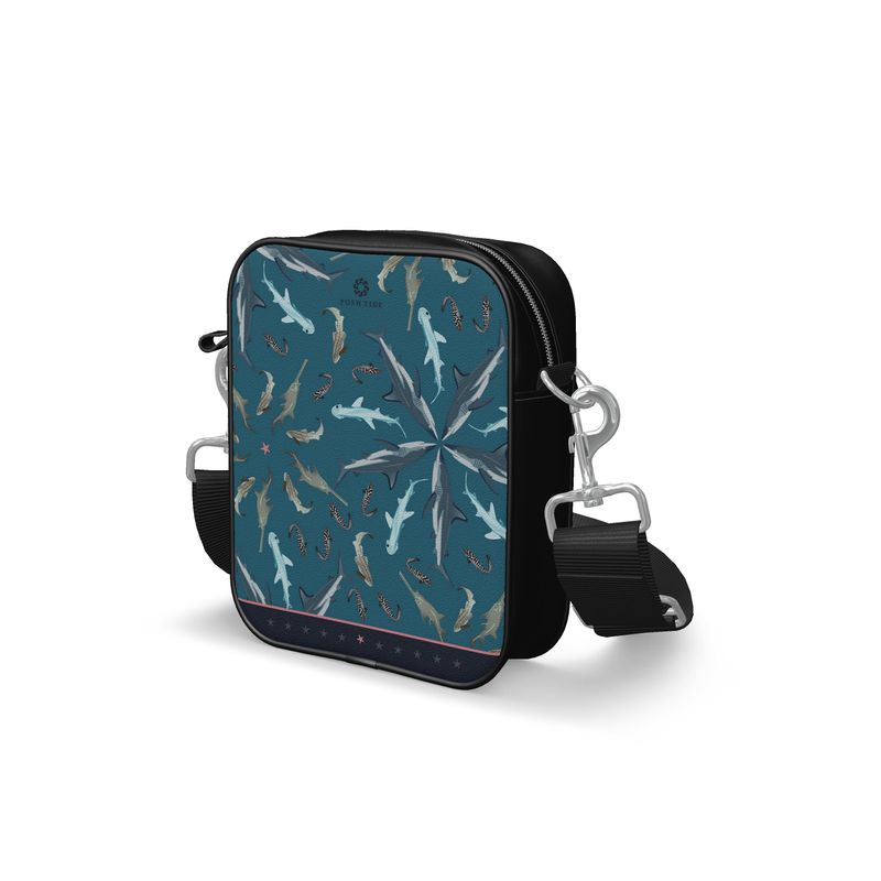 Are you looking for a stylish and practical bag that can keep all your essentials safe and organized? Our cross-body messenger bag is the perfect solution for all your carrying needs. With its top-zip design, you can easily access all your items. The strap is also adjustable, so you can wear it at the perfect length for your body. If you need to leave your bag unattended, the strap can be easily clipped to a café chair for added security. The front panel is made of smooth leather and is adorned with sharks that are known to reproduce through parthenogenesis. The back side also features a convenient zip pocket, perfect for storing small items that you need to access quickly.