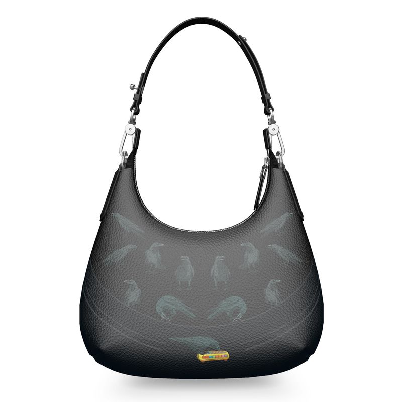 This bag is mini but mighty with curves in all the right places. It fits right under your arm. The accents and shoulder strap are made from smooth black leather for a clean, pulled-together look. It features illustrations which are a tribute to ravens — clever, playful and mischievous birds which can mimic human voices and recognize faces. Measures 10.2" x 9.4"