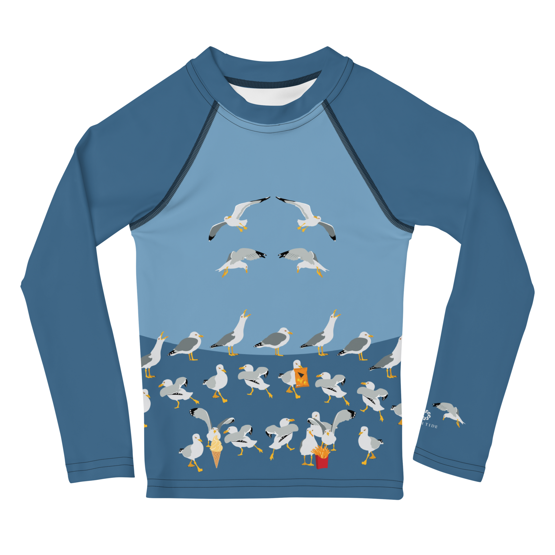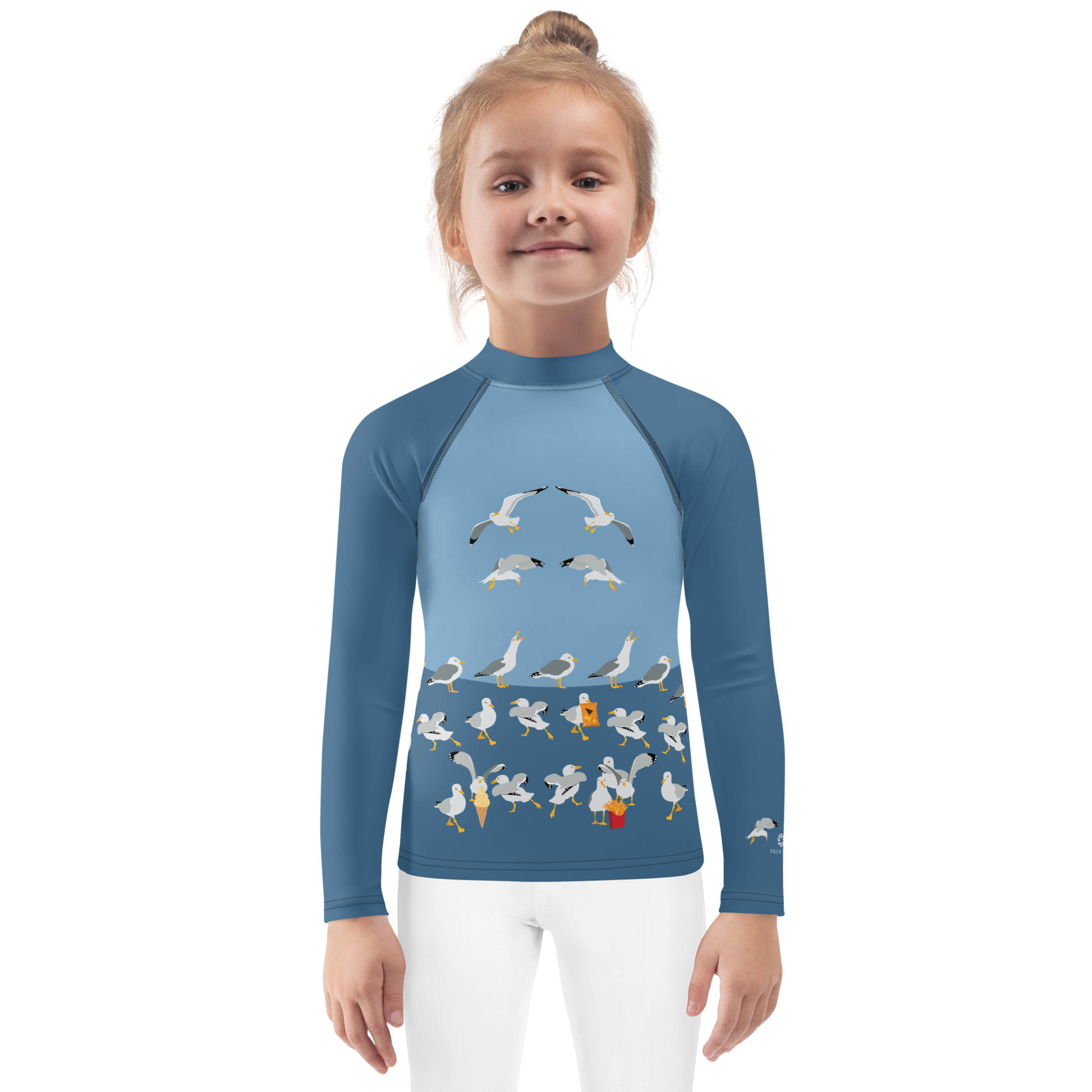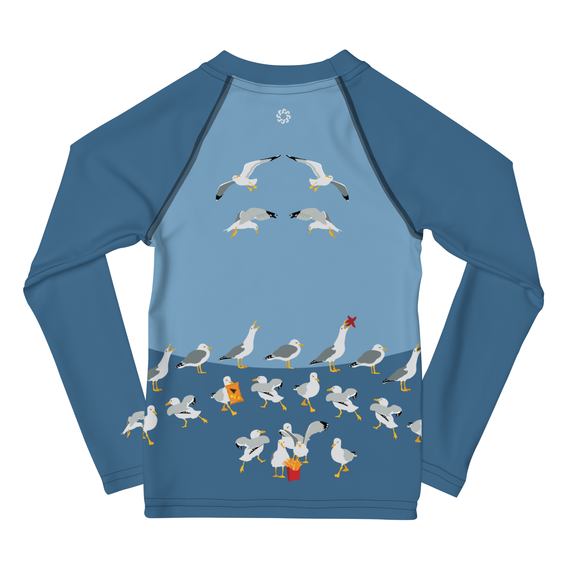 This smooth, slim-fitted, and versatile long-sleeve rash guard with flat ergonomic seams will protect you while you have fun being sporty or while at the beach. Beach being the operative word; the illustrations are a tribute to seagulls, masters of the sky and scavengers extraordinaire. With the finesse of a toddler at a buffet, they have perfected the art of swooping in to snatch a sandwich right out of your unsuspecting hand. Just when you thought it was safe to enjoy your seaside snack, beware!