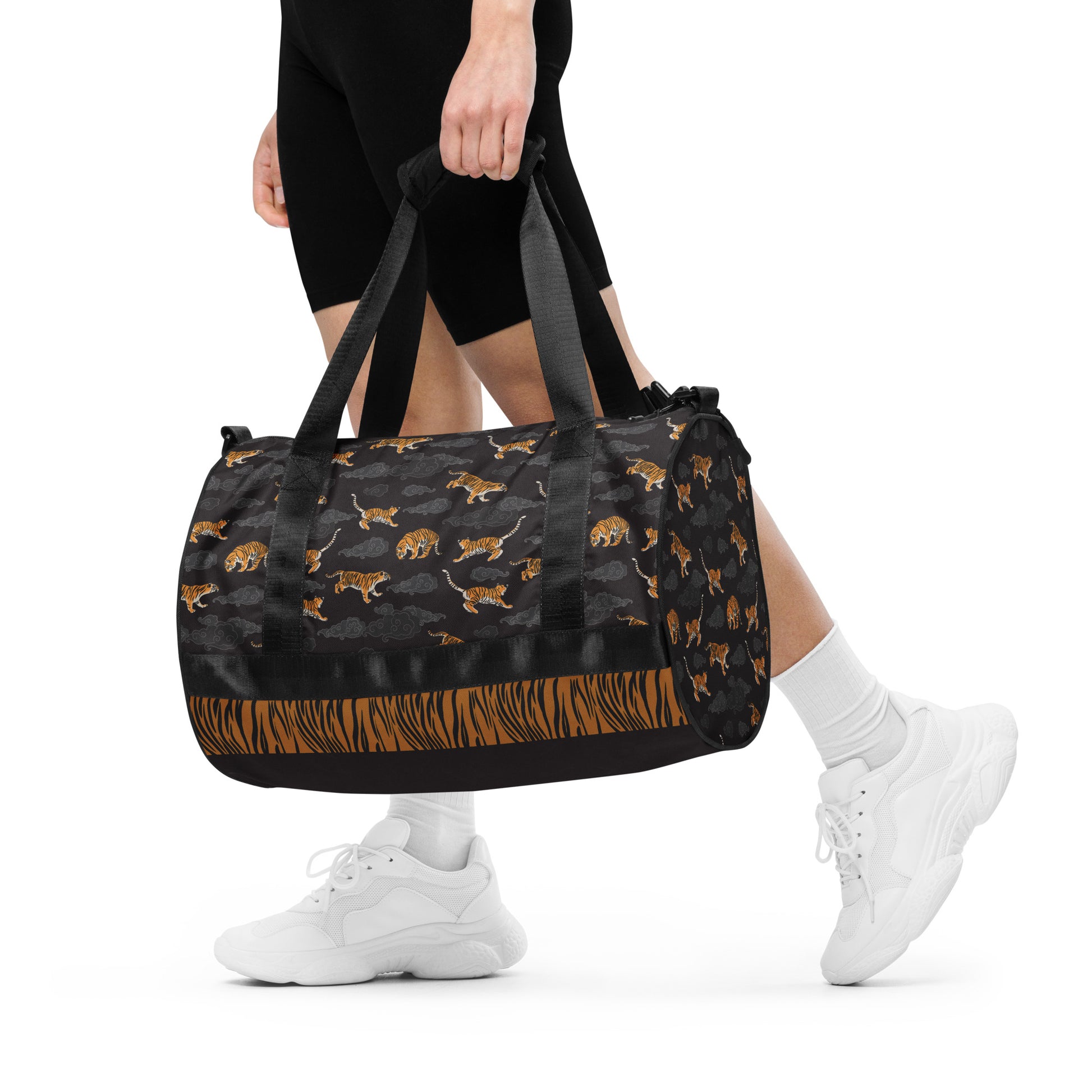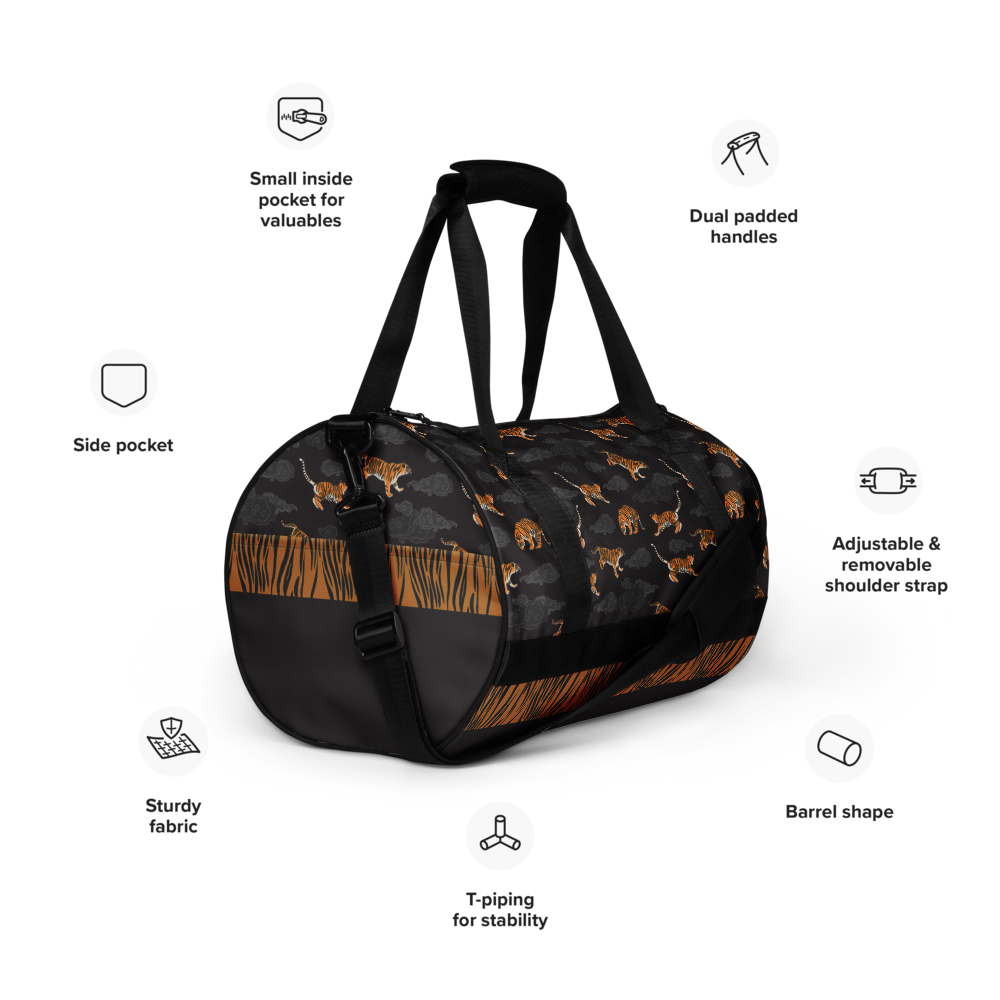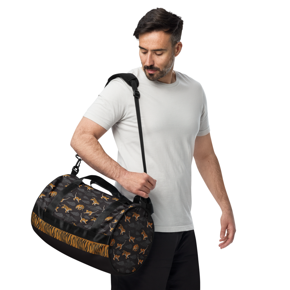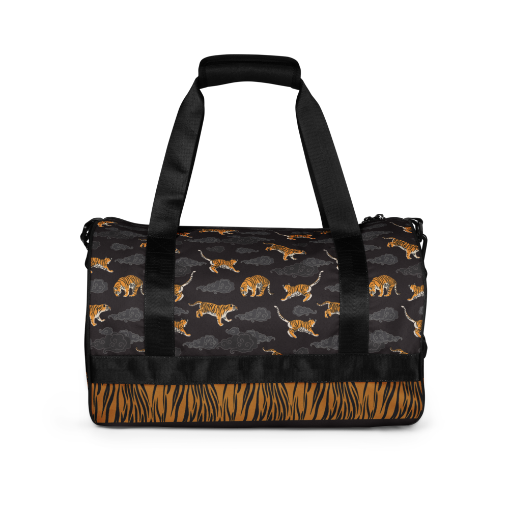 Ready to get your fitness on? This gym duffel bag is decorated with illustrations inspired by tigers. Panthera tigris is the largest wild cat in the world. Here they jump and play through auspicious clouds across this practical bag. If you are a fan of felines, you will love this piece. Add some punch to pumping iron with this gym bag. Made from sturdy, water-resistant fabric, this bag is fun meets function. And it’s got pockets!