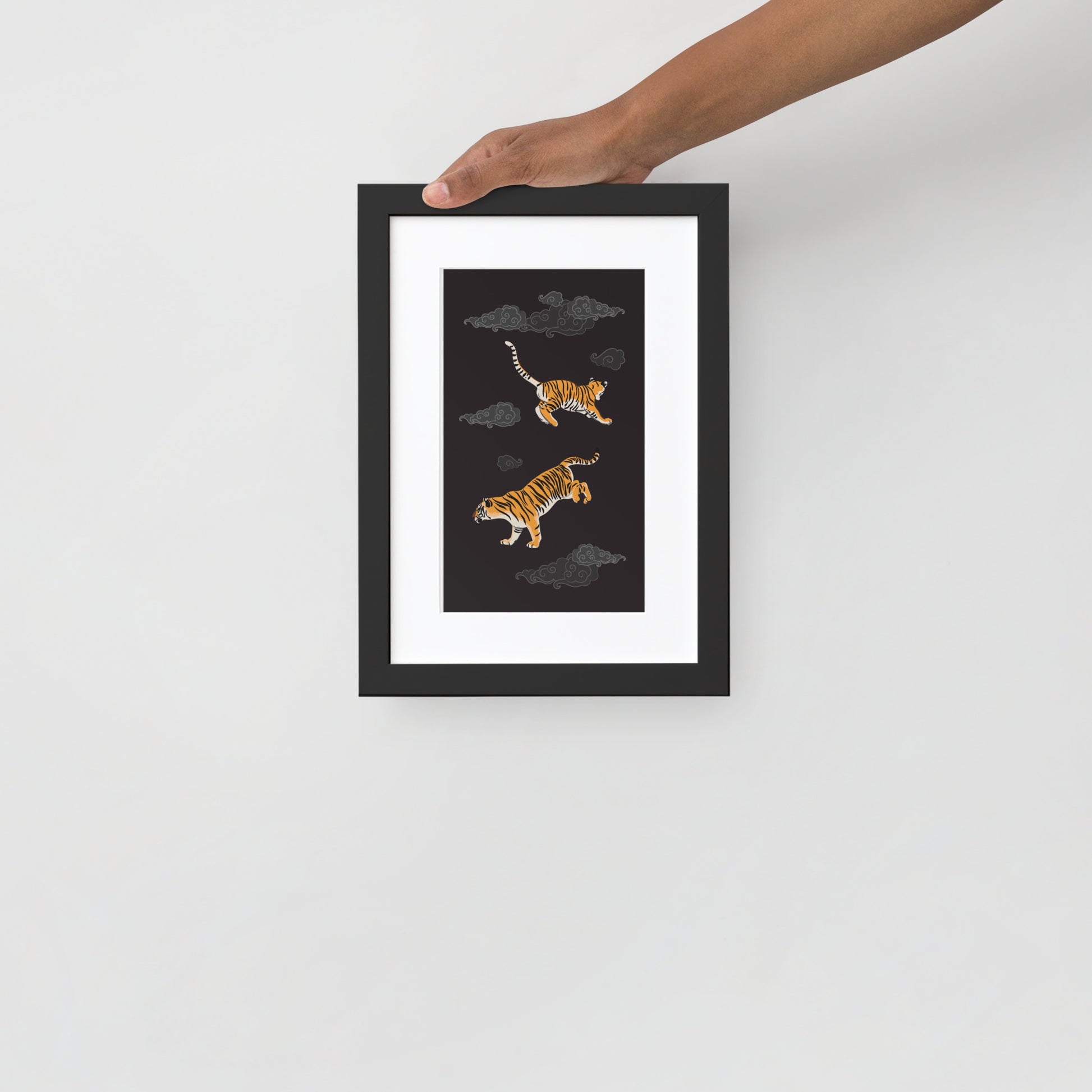 Panthera tigris is the largest wild cat in the world. These illustrations show them as they jump and play through auspicious clouds. Make any room look more sophisticated with this framed poster including a smooth, white mat board. It’s printed on a quality matte paper and framed with a semi-hardwood alder frame.