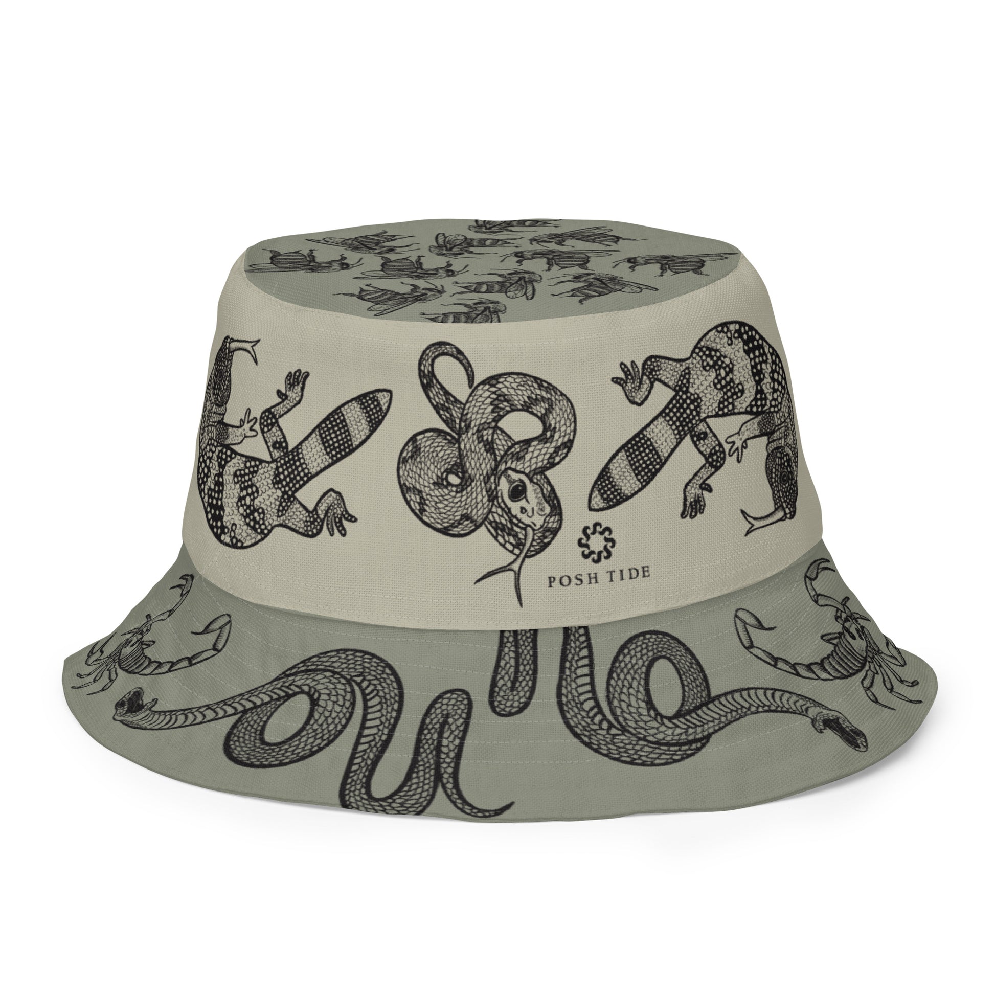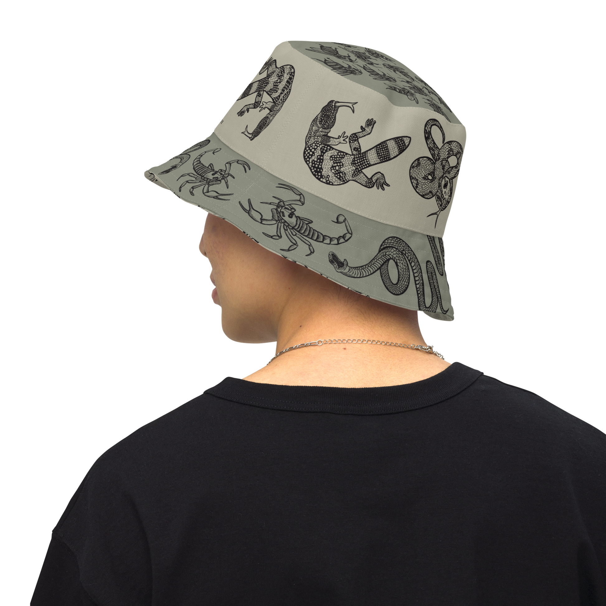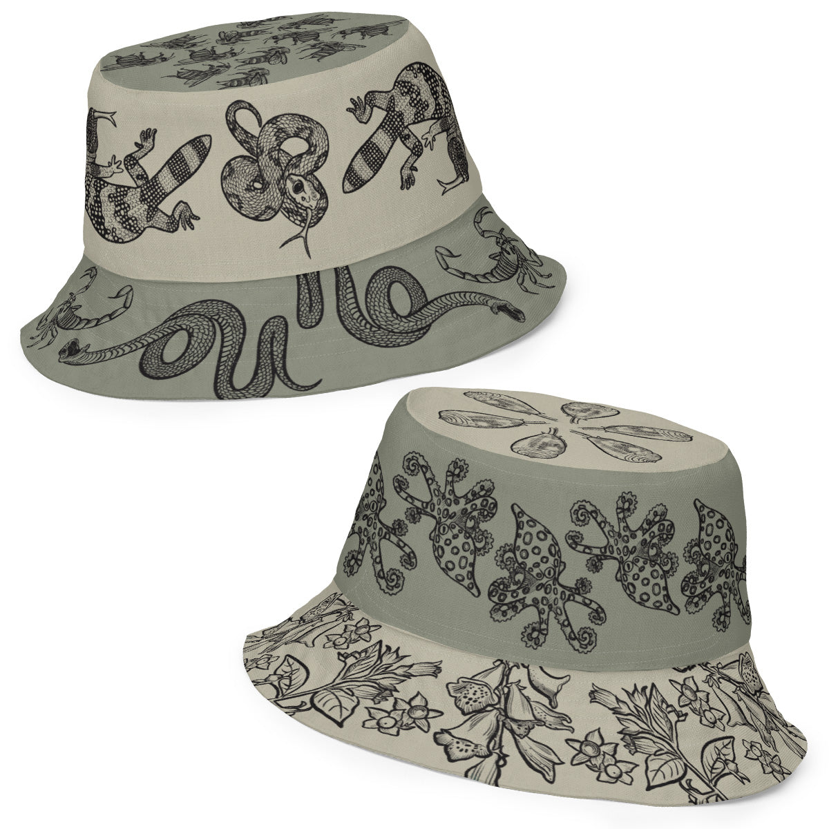 Two hats for the price of one! This Reversible Bucket Hat features illustrations which are a tribute to venomous animals. Their venom is being researched to find cures for diseases, pain relief, and drug-resistant infections. It got me thinking about other venomous animals. The intricate illustrations on this hat capture the essence of this keystone species while honoring their amazing contribution to the medical field. and worn on both sides, making it easy to match with different outfits. Made of breathable premium fabric.