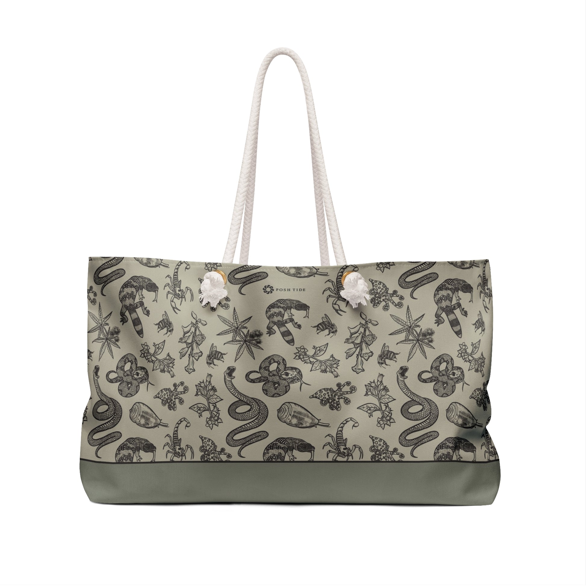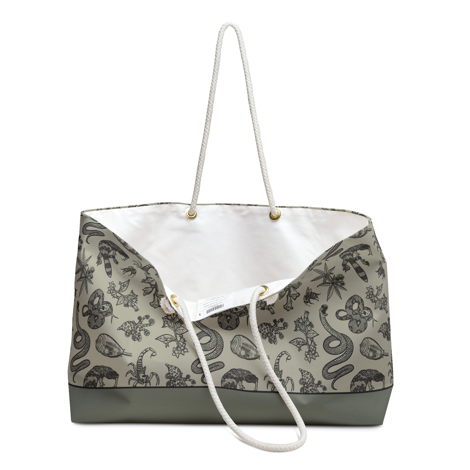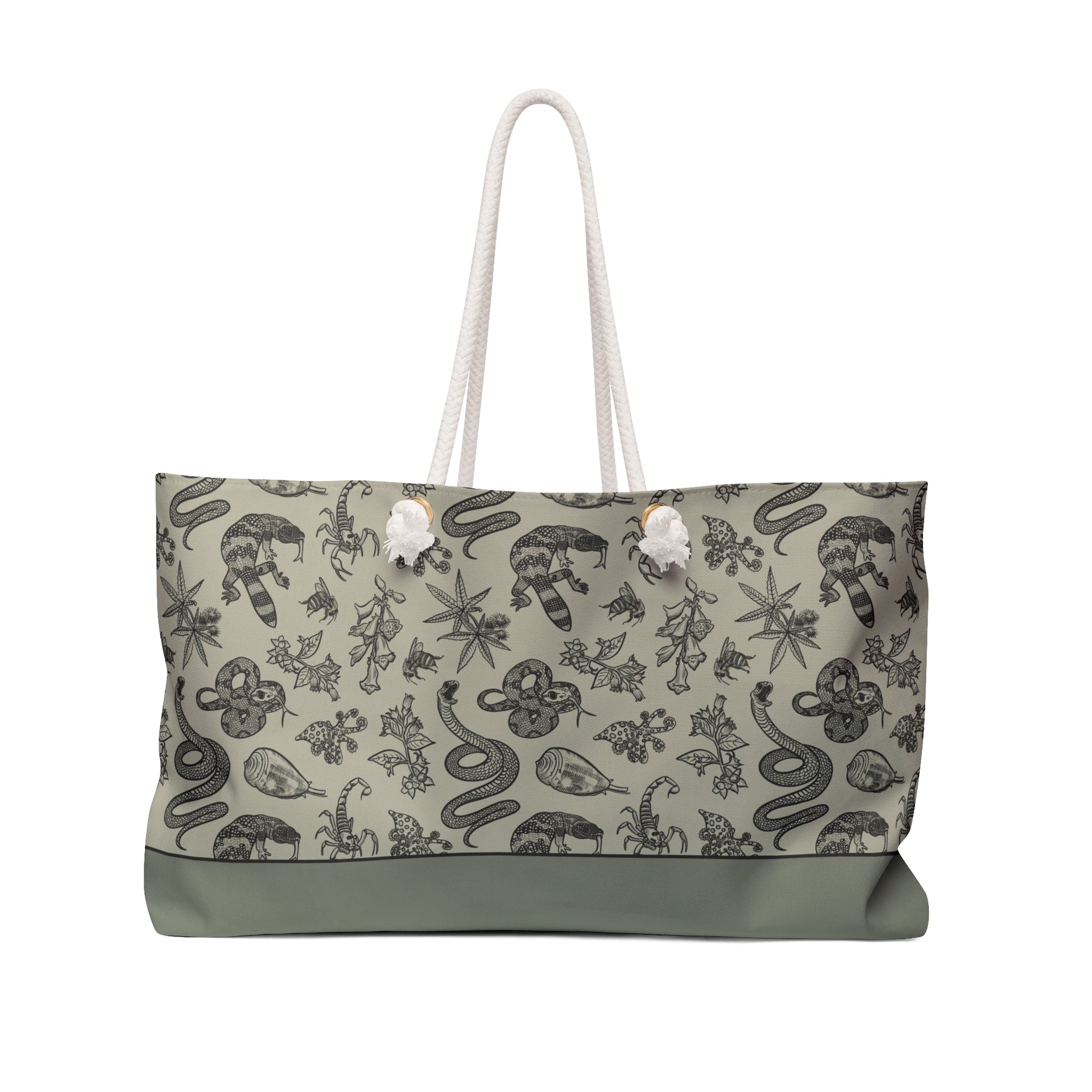 The illustrations on this oversized Weekender Tote are a tribute to venomous animals. Their venom is being researched to find cures for diseases, pain relief, and drug-resistant infections. This tote is perfect for your weekend at the beach or in town. The wide-mouthed, durable bag holds a generous amount of personal items and is easily held by its thick rope handles.