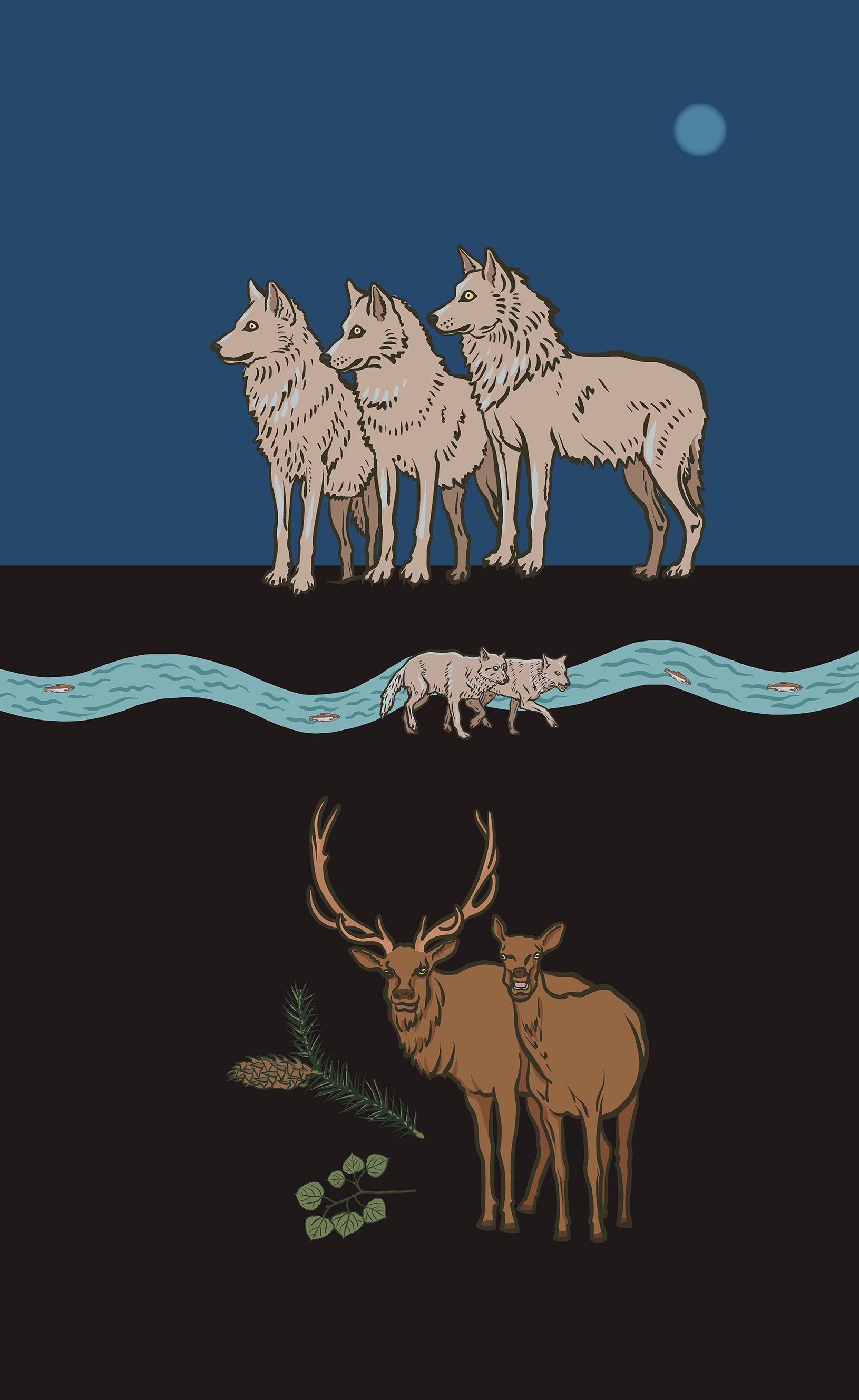 This framed poster features beautiful illustrations of the wolf trophic cascade, where the reintroduction of wolves into an ecosystem caused a ripple effect that literally transformed the landscape! The presence of the wolves led to a decrease in elk populations, which in turn allowed vegetation to flourish. As a result, the banks of rivers became more stable, and the rivers themselves shifted course and many songbirds returned.